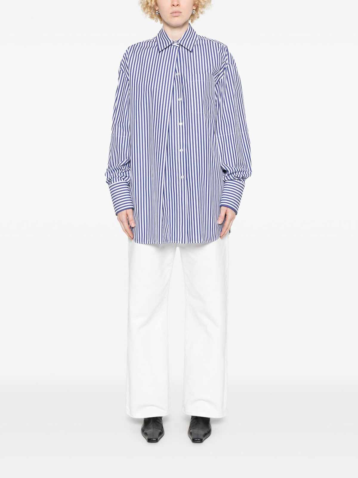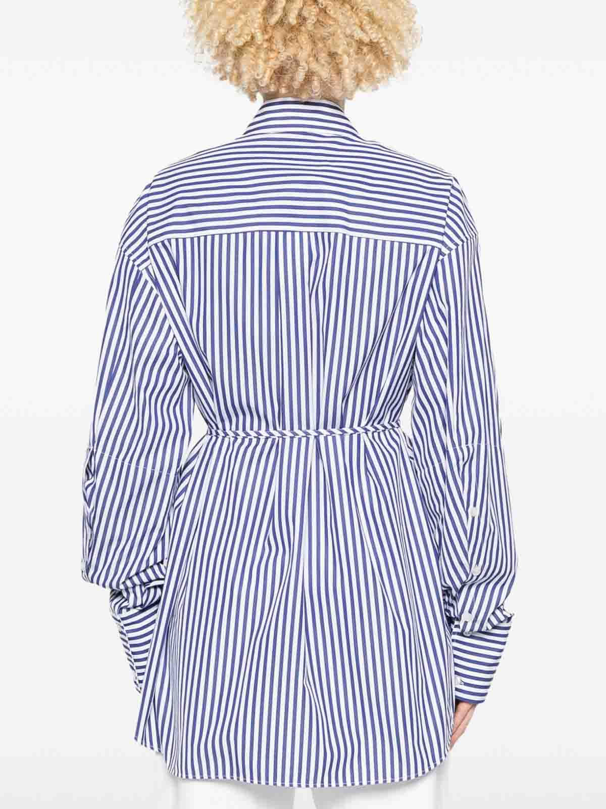 Chaqueta larga de popelina de algodón puro a rayas de gran tamaño, con hombros caídos y costuras en los codos que sujetan un segundo puño interno. La confección presenta un canesú trasero con pliegues en contra y puños con tres botones en la parte delantera. El cinturón textil es perfecto para ajustar el ajuste como se desee y definir la silueta. Dobladillo redondeado. Corte holgado.