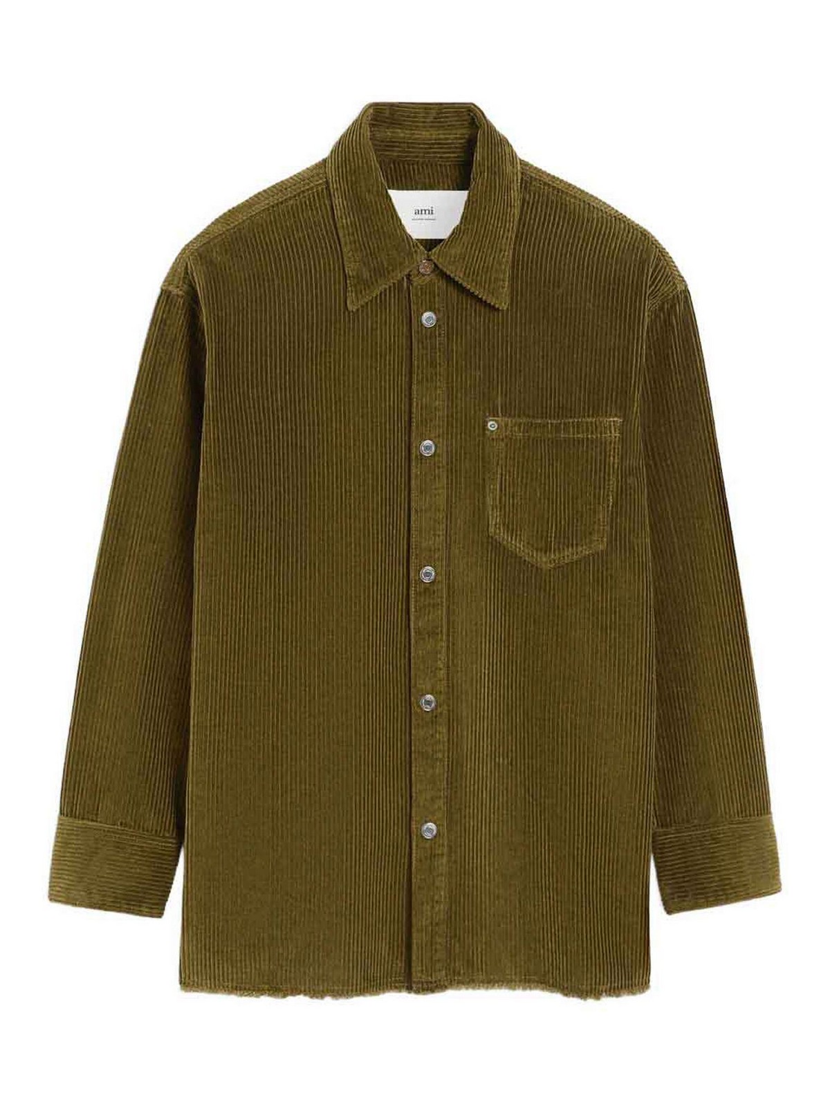 Bolsillo tipo parche con logotipo y cierre de botones con textura de pana verde oliva