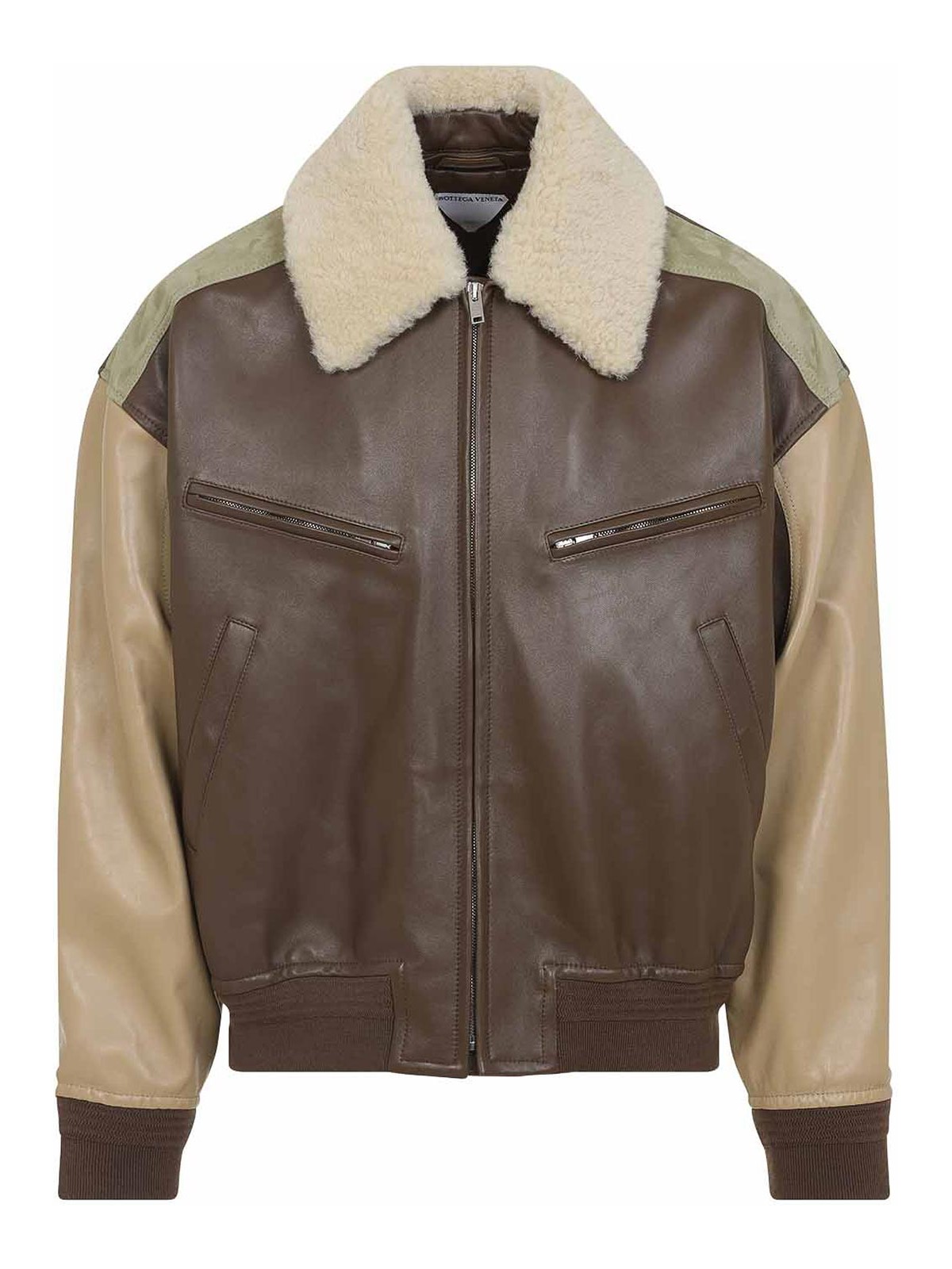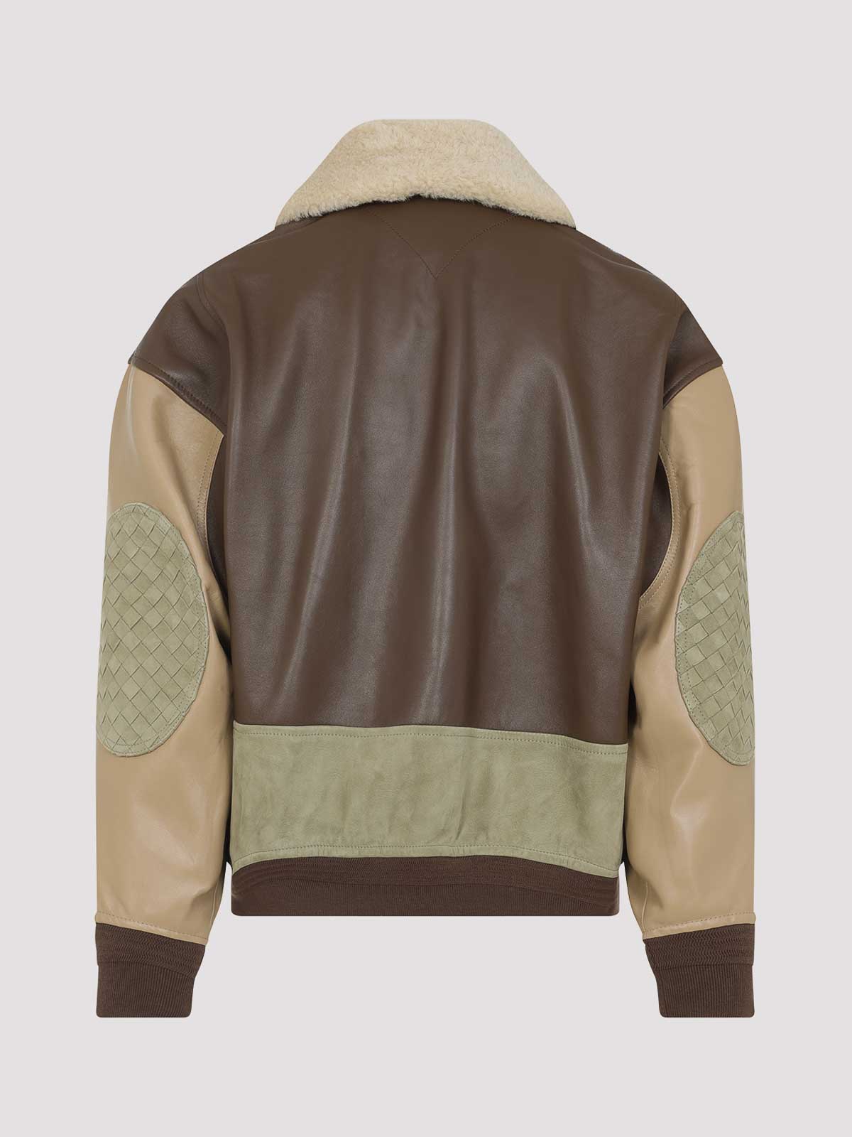 Chaqueta tipo blusón de napa marrón Bottega Veneta. Confeccionada en piel beige, verde y marrón, confección de retazos, cuello de piel de oveja beige desmontable, hombros caídos, mangas largas, cuatro bolsillos en la parte delantera, parche de piel intercalada en los codos, bordes acanalados, forrada.