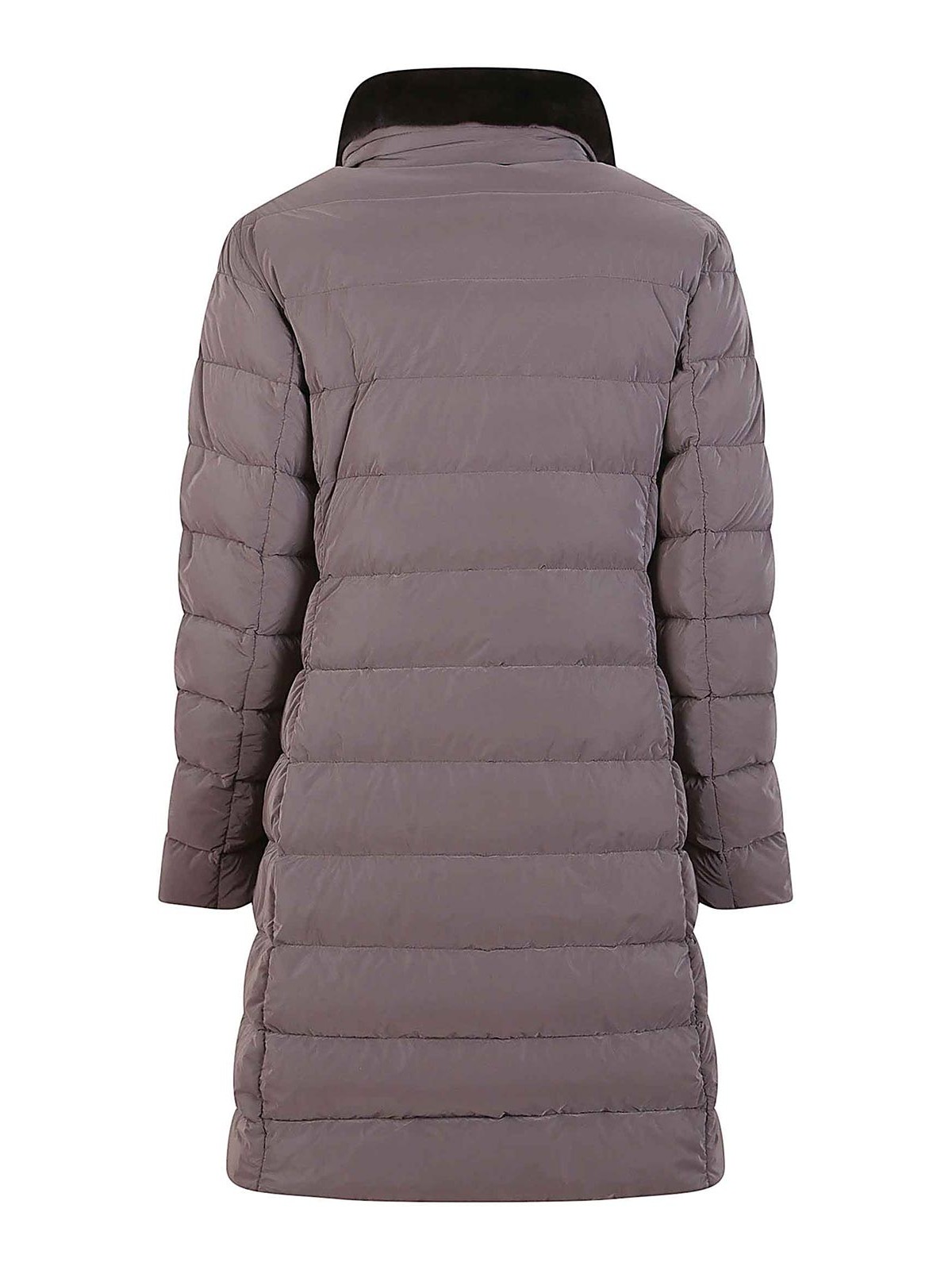 Chaqueta de nailon de color cacao, acolchada con plumón de ganso, cuello alto con piel de rana y piel auténtica extraíble, cierre cruzado con botones y cremallera oculta, bolsillos con solapa.