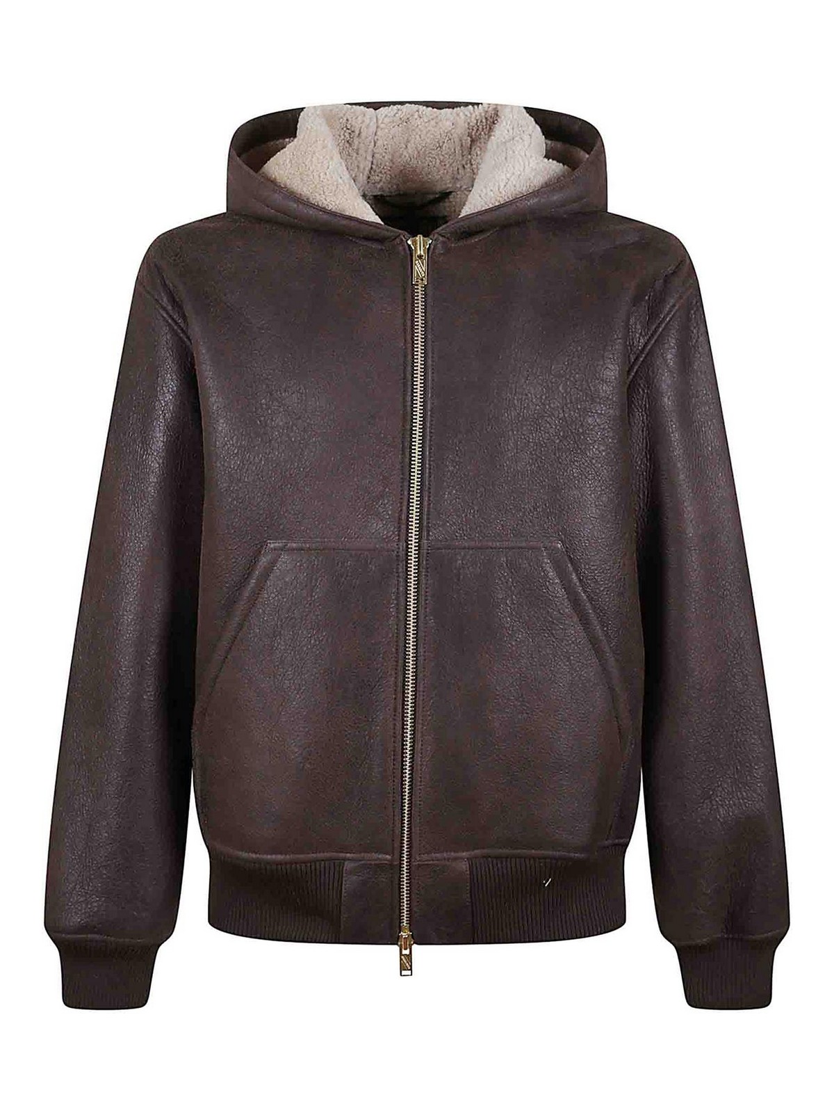 Chaqueta de piel de cordero marrón oscuro, cierre con cremallera, capucha, bolsillos tipo canguro, dobladillo y puños acanalados.