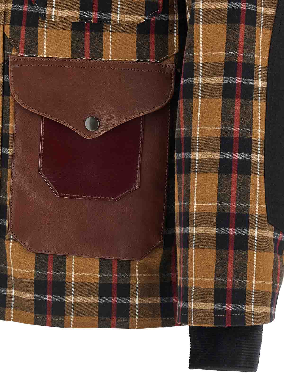 Chaqueta Watanabe Filson x junya, confeccionada con retazos multimateriales, cuello camisero de pana, cierre con botones en la parte delantera, bolsillos, mangas largas de doble capa con puños, abertura trasera con botón, sin forro.