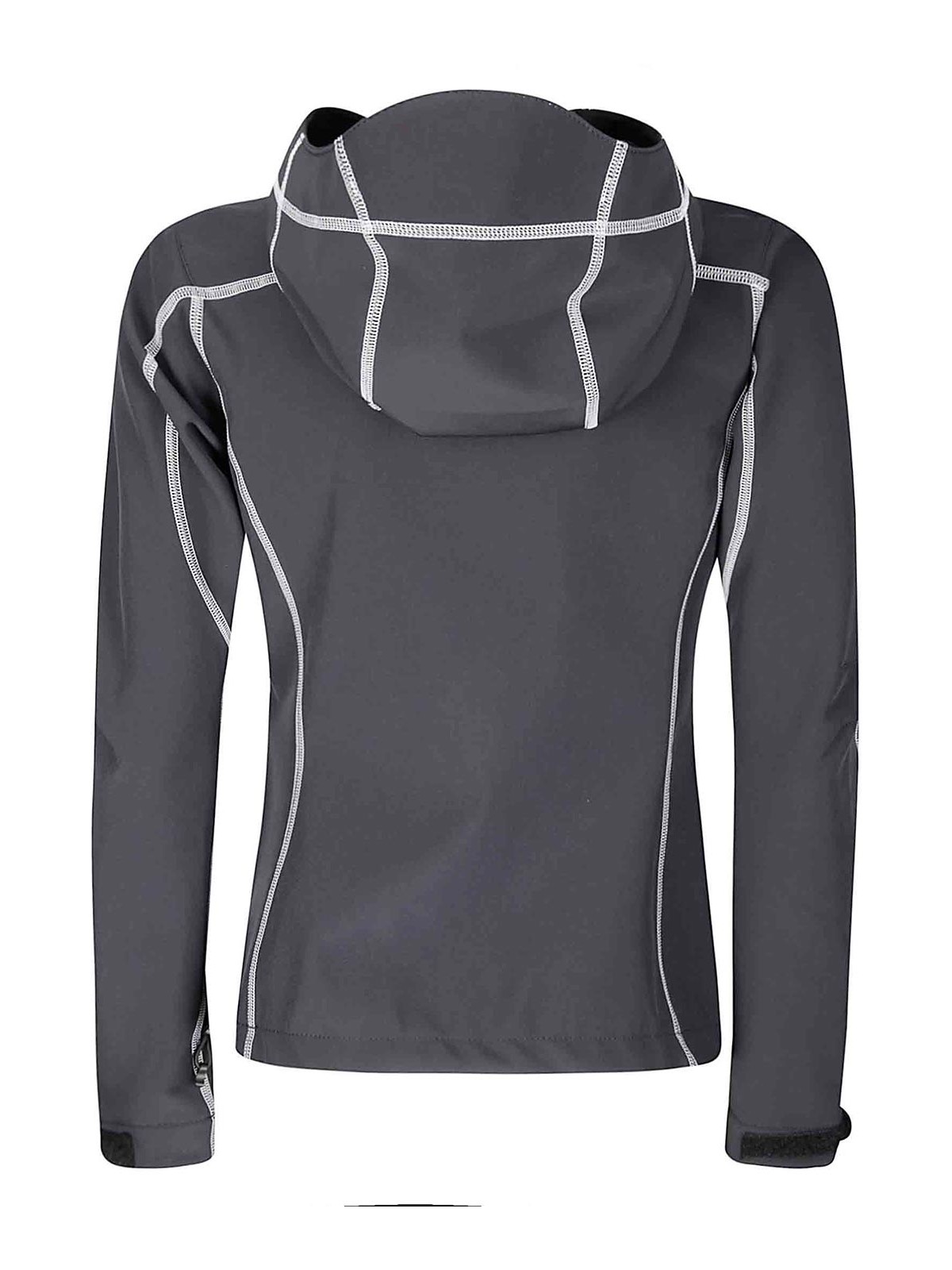 Chaqueta de material técnico apta para climas duros, cierre con cremallera, capucha, bordados en contraste.