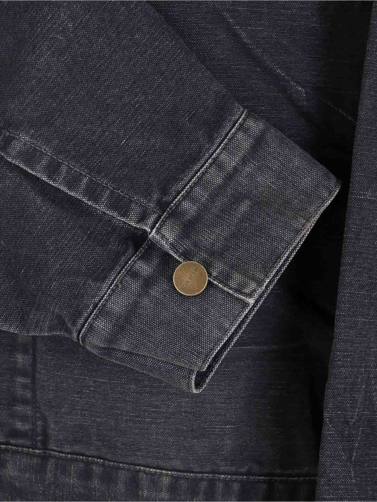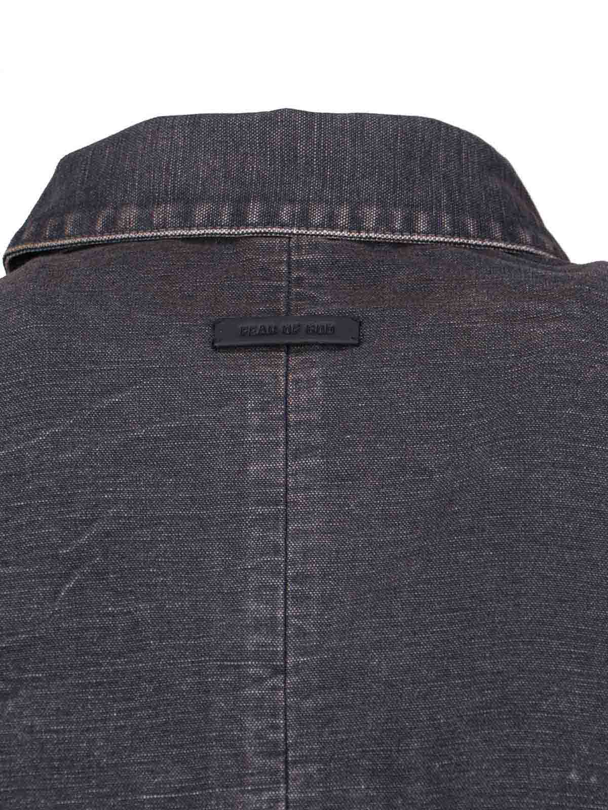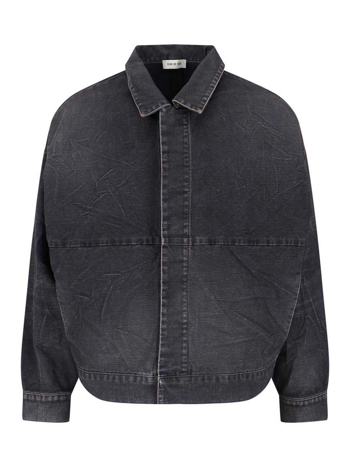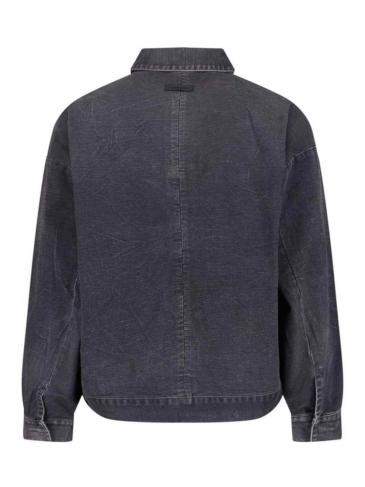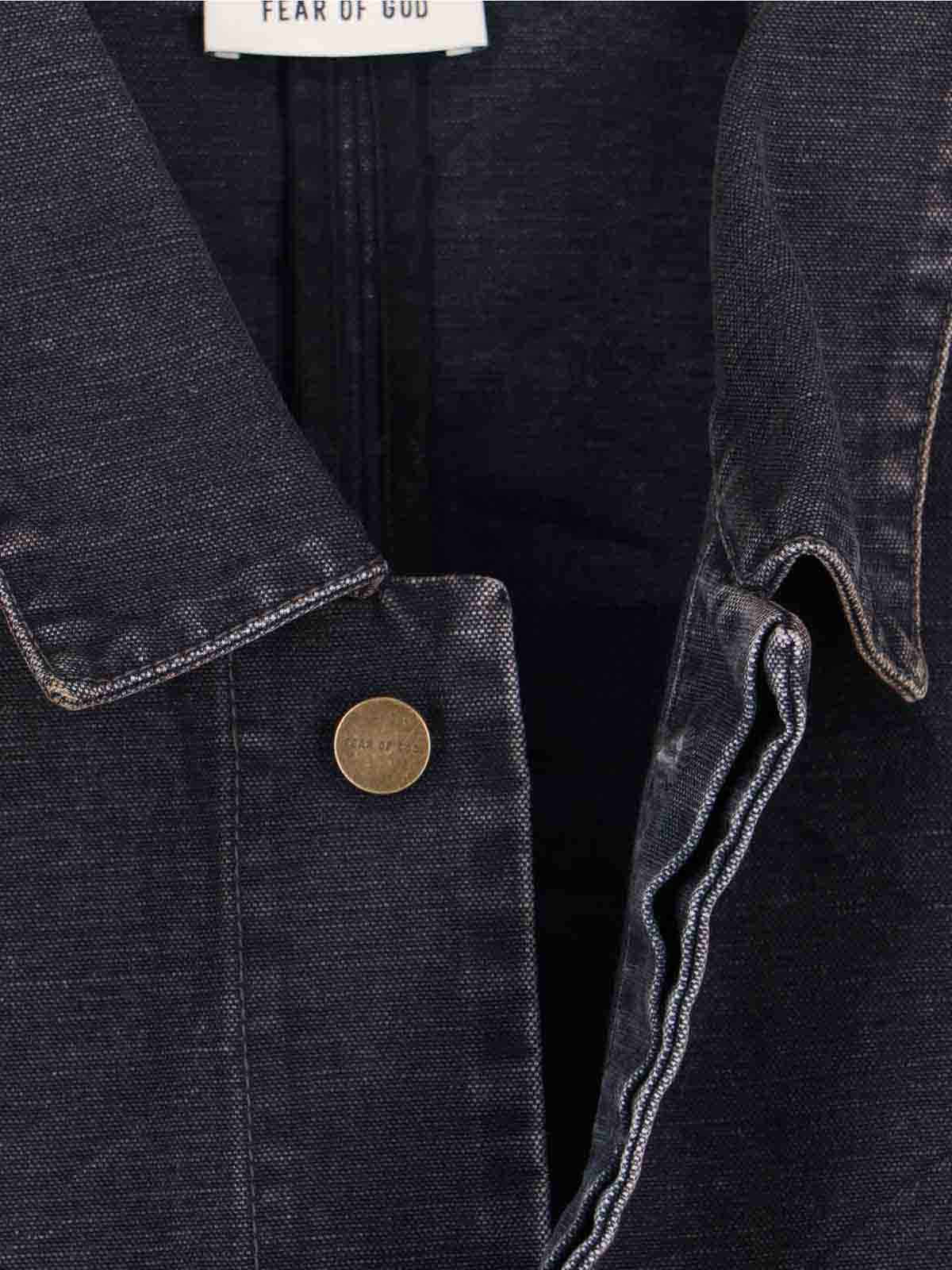 Chaqueta utilitaria Fear of God, confeccionada en lona de algodón negra, desgastada, cuello clásico, cierre con botones ocultos, dos bolsillos frontales, etiqueta con el logotipo aplicada en la parte posterior, puños abotonados y dobladillo recto.