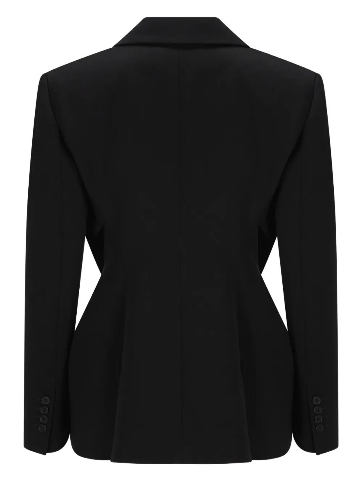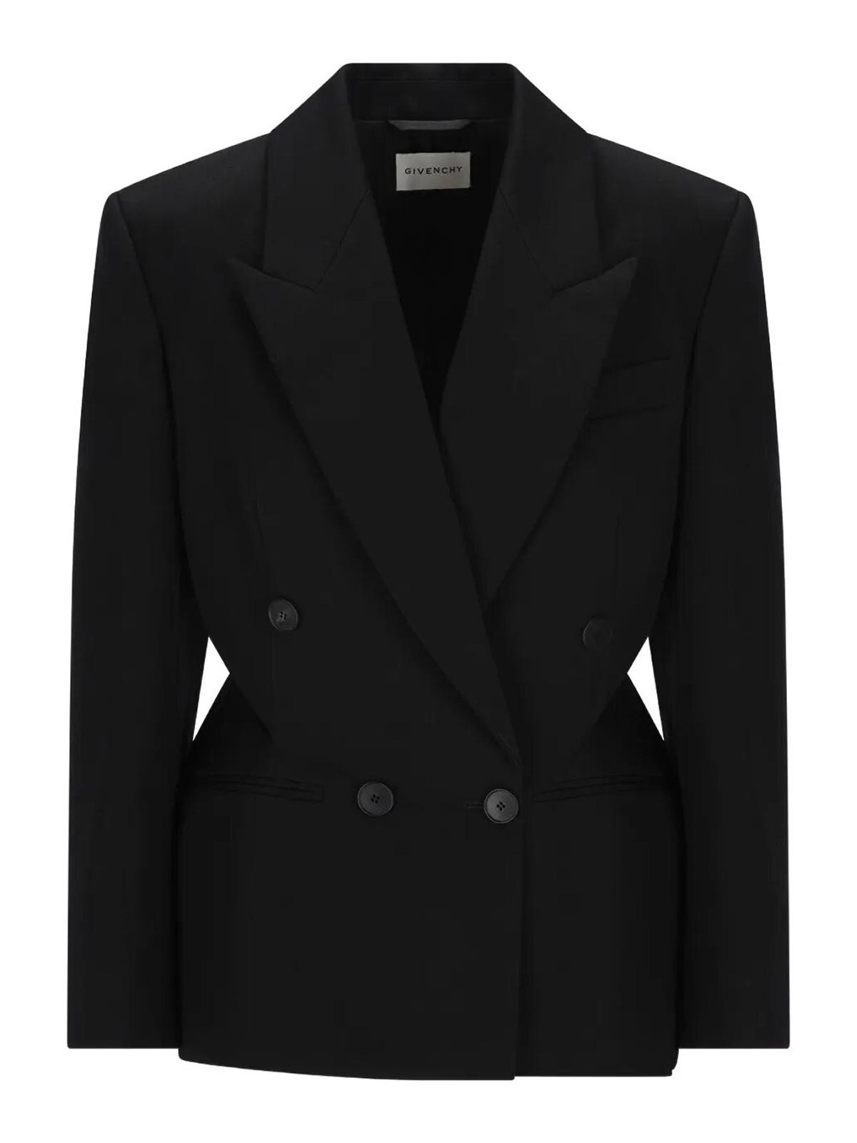 Chaqueta estructurada de lana granulada, cuello puntiagudo, aberturas laterales, botonadura cruzada, un bolsillo en el pecho, dos bolsillos frontales, forro de satén.