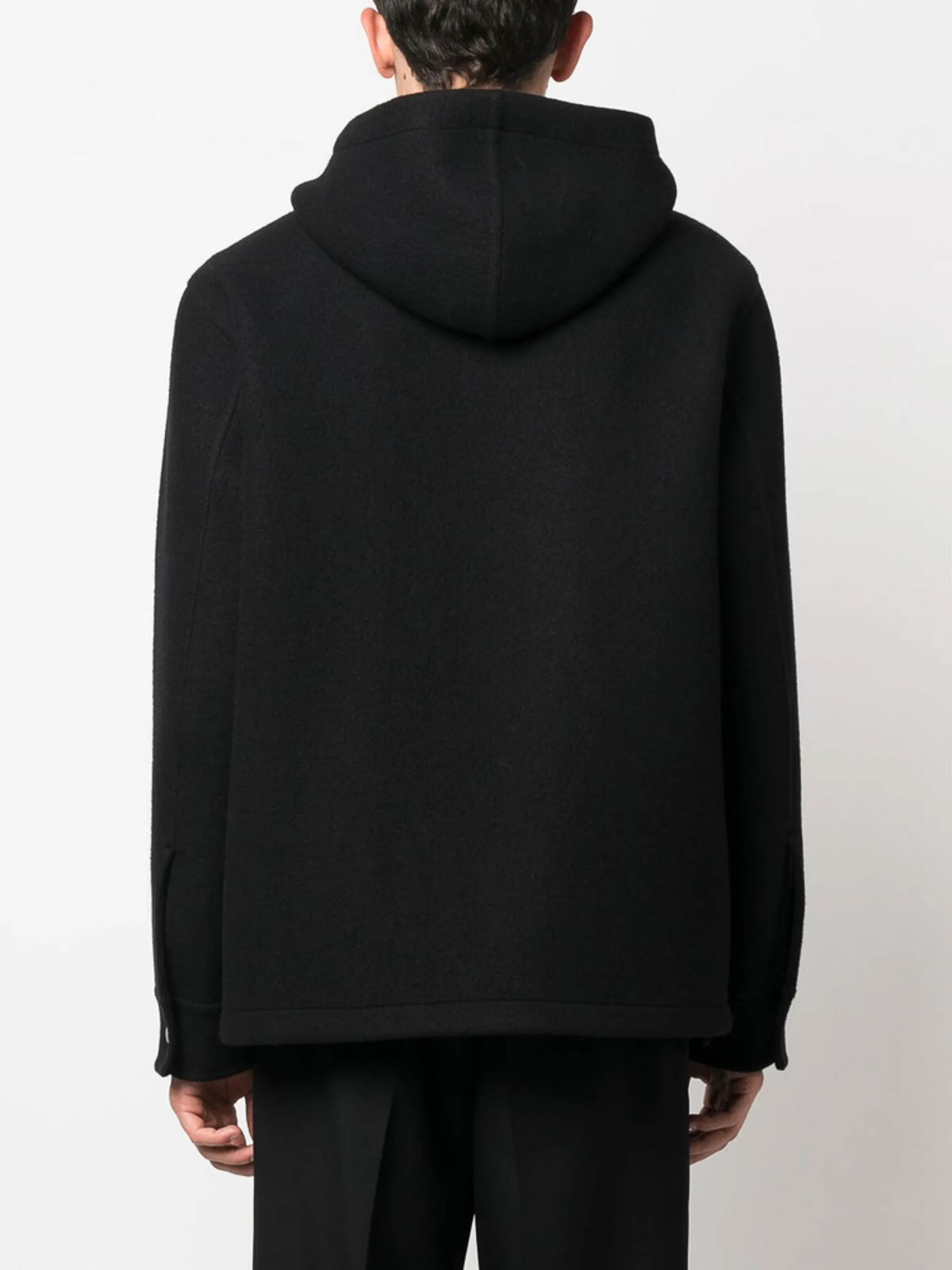 Capucha con cordón con acabado de fieltro negro, cuello abierto, cremallera bidireccional, mangas largas, dobladillo recto