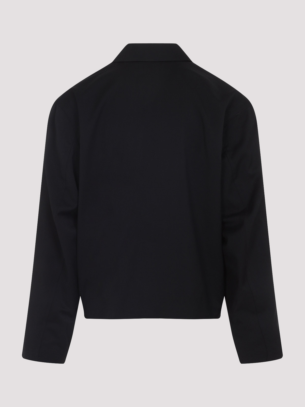 Nuestra minichaqueta de lana virgen negra tradicional. Chaqueta de lana virgen negra pura, cuello puntiagudo, cierre con cremallera en la parte delantera, bolsillos con aberturas laterales, mangas largas, dobladillo recto, costuras tonales.