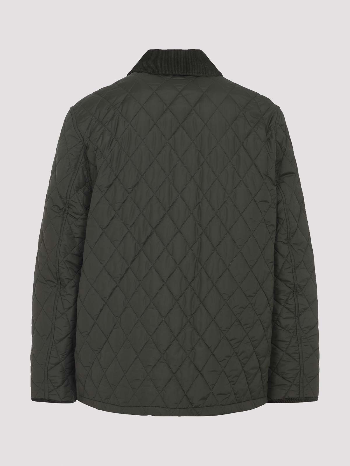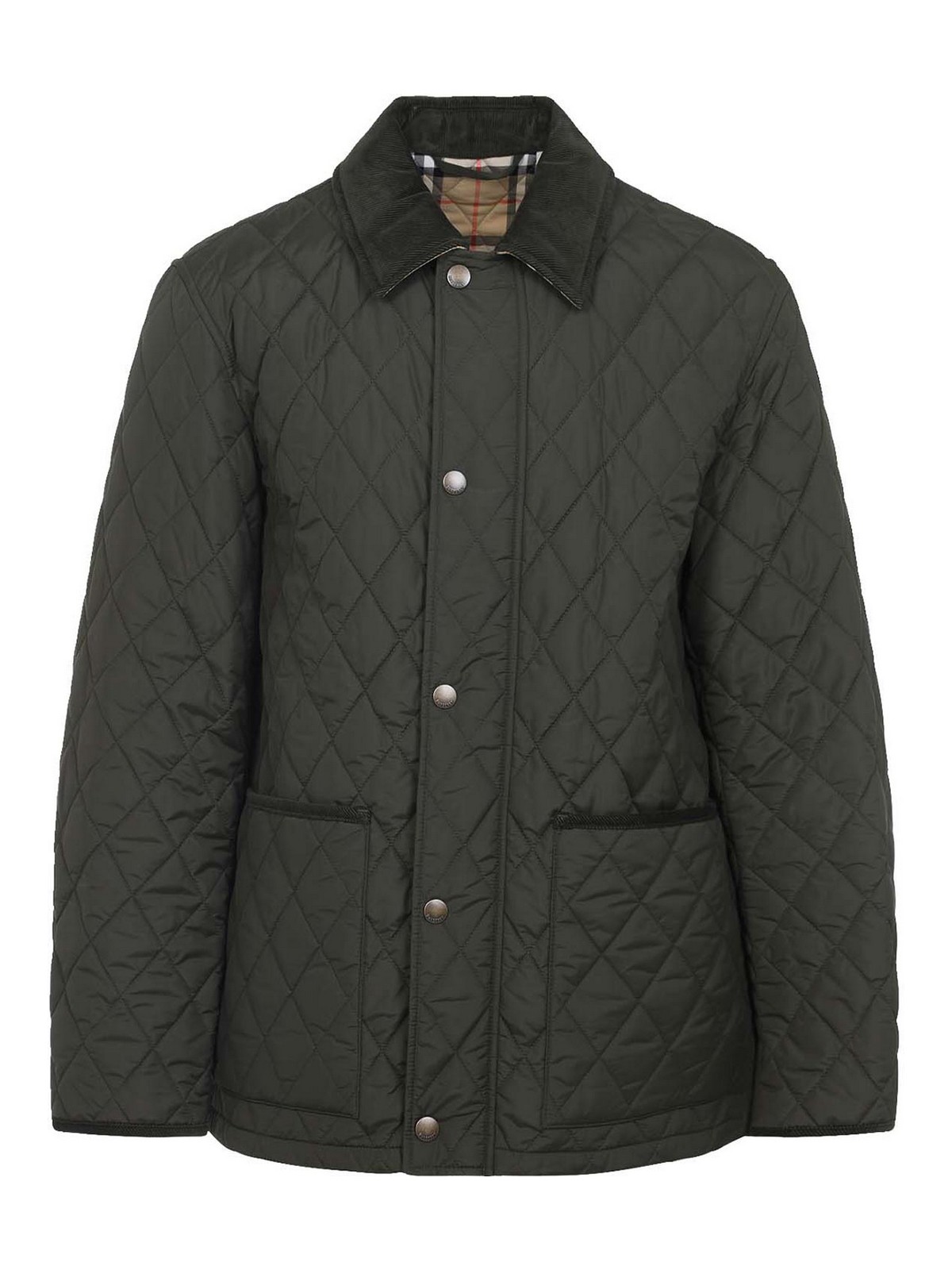 Chaqueta Burberry Haddington verde confeccionada en agua verde, pana tonal repelente, cuello puntiagudo, botón a presión y cremallera oculta, dos bolsillos de parche, manga larga, estampado a cuadros