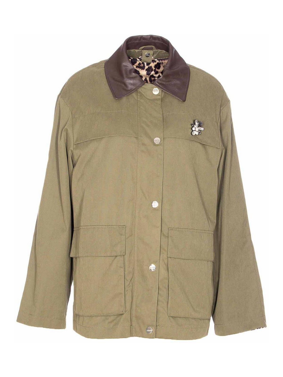 Chaqueta gruesa verde Liu jo con botones frontales y cierre con cremallera, cuello regular, mangas largas, bolsillos con cierre de botones, detalle de aplicación de cristales