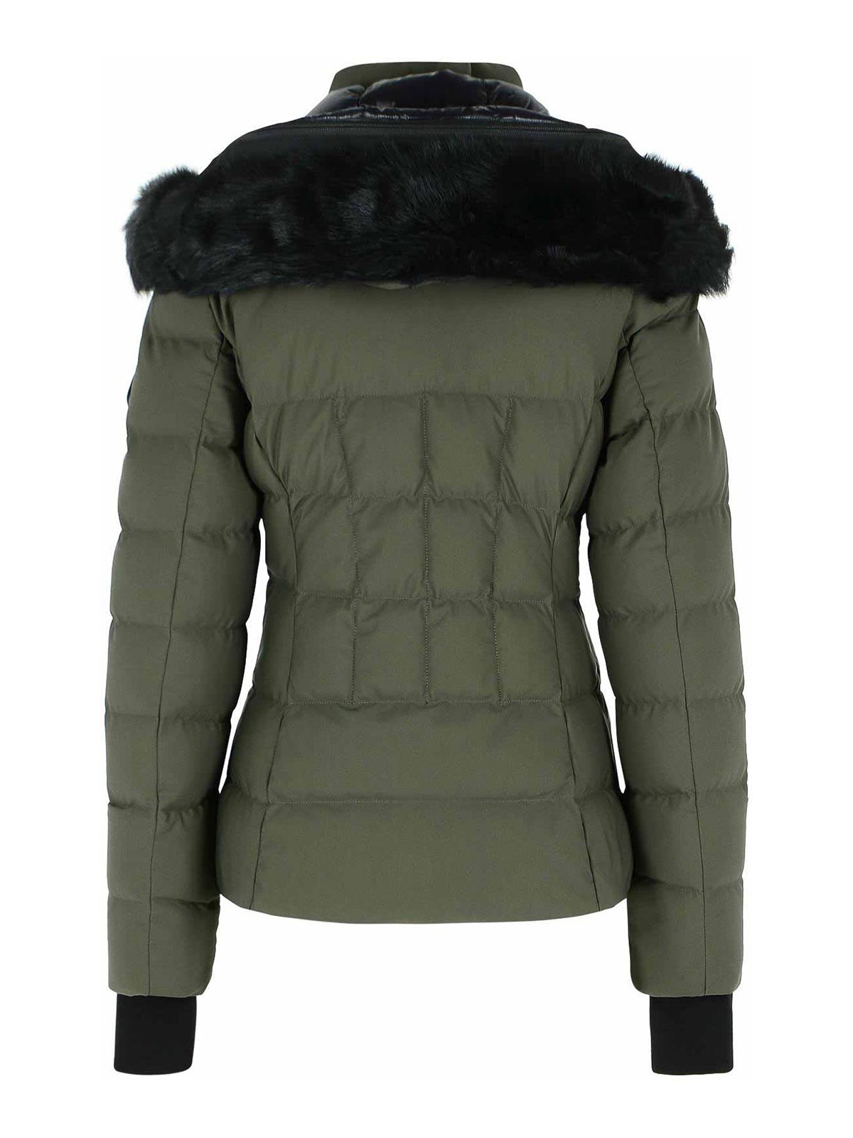 Cuello elevado, capucha con cordón extraíble mediante botones, pelo sintético que se puede aplicar en la capucha mediante cremallera, cierre frontal con cremallera oculto mediante solapa con botones a presión, bolsillos laterales con cremallera, parche con logotipo metálico en el hombro, puños acanalados, acolchado en mezcla de plumas de ganso