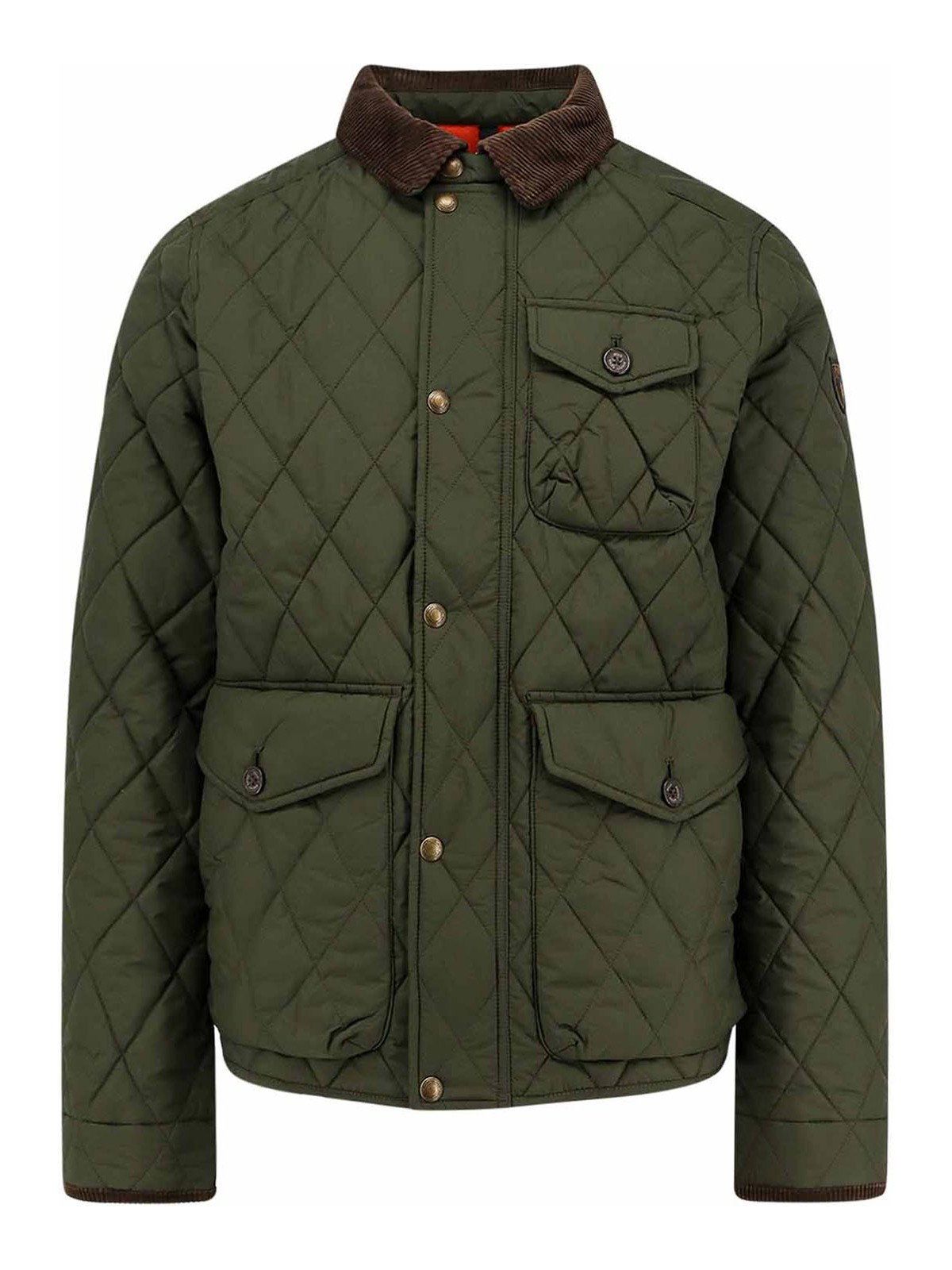Cierre con cremallera oculta y doble corredera, botones a presión metálicos externos, cuello de pana, tres bolsillos frontales con solapa y botón, parche con el logotipo en la manga izquierda, acolchado Primaloft de poliéster reciclado
