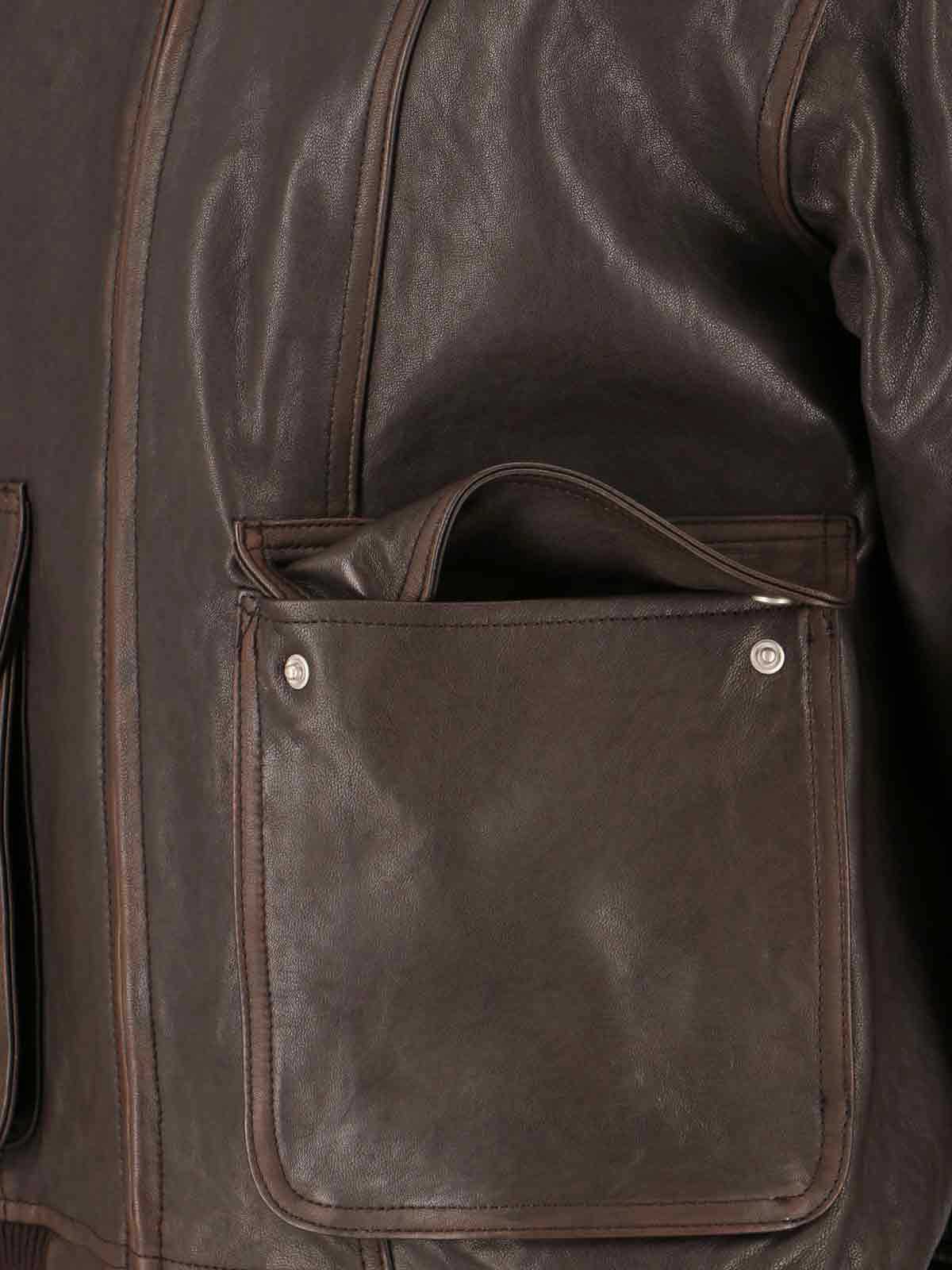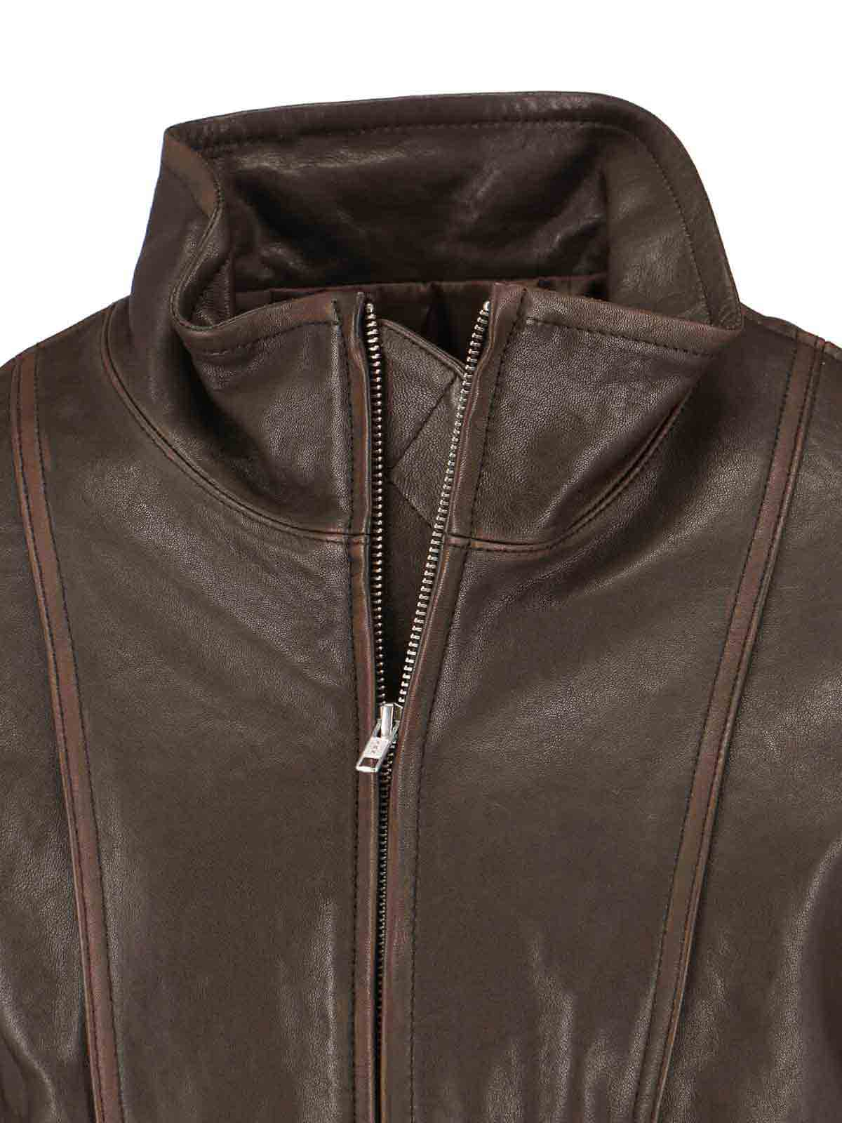 Chaqueta Dunst de piel de cordero, marrón, efecto desgastado, cuello alto, cierre con doble cremallera, dos bolsillos frontales, un bolsillo plano interno, detalles de costuras visibles, acabados elásticos acanalados, dobladillo recto.