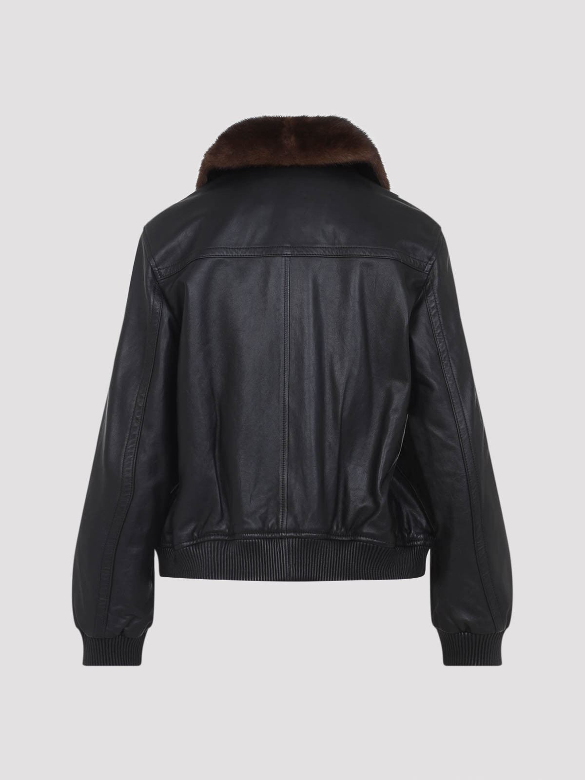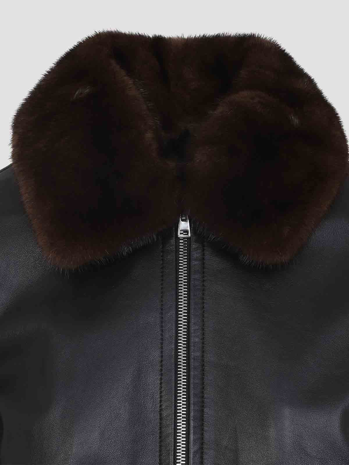 Chaqueta negra Yves Salomon confeccionada en negro, cuello de visón puntiagudo desmontable, bolsillos laterales con cremallera, mangas largas, puños y dobladillo elásticos acanalados