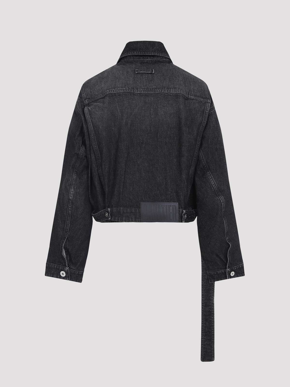 Chaqueta vaquera negra de gran tamaño de Jean Paul Gaultier confeccionada en mezclilla negra, cuello puntiagudo, correa alargada con botones en la tapeta, dos bolsillos con solapa en el pecho, hombros caídos, mangas largas y anchas, puños abotonados, trabilla para cinturón en la parte posterior, canesú con botones ajustables en los dobladillos laterales, etiqueta de la marca en el dobladillo trasero