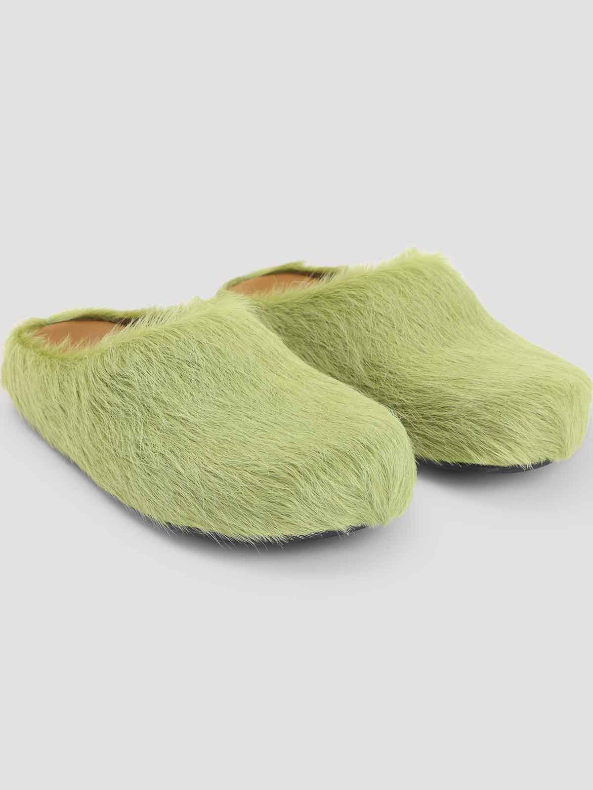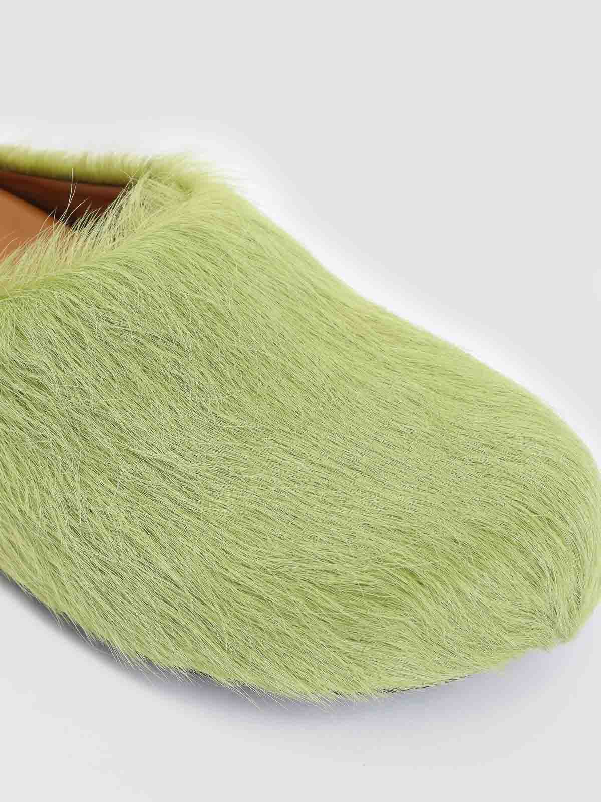 Mulas Fussbett sabot de pelo de becerro de color lima. Sabot de pelo de becerro de lima pura, punta redonda, estilo sin cordones, suela de goma, efecto peludo.