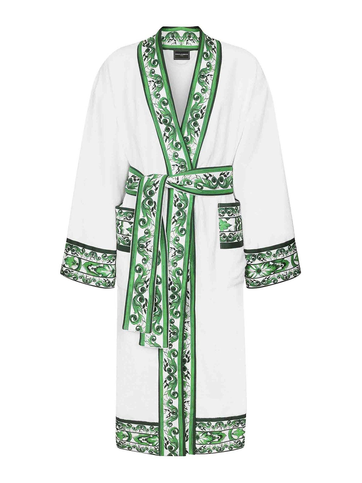hecha de esponja de algodón ligera, equipada con bolsillos de parche, detalles estampados de lino y algodón en los puños, bolsillos, ribetes y parte inferior, cinturón a juego, fabricado en Italia, color: blanco, verde