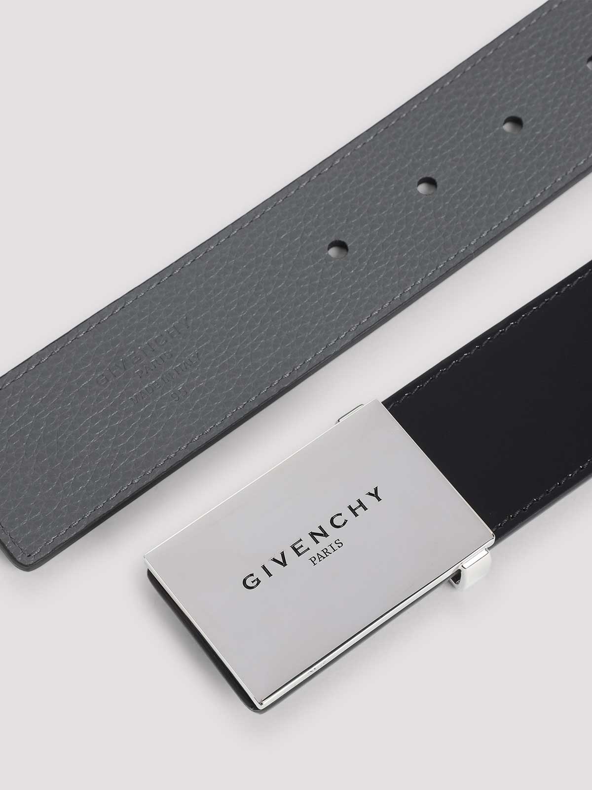 Cinturón Givenchy de piel de becerro negra y gris con placa metálica. Confeccionado en piel de becerro granulada, diseño reversible, un lado en gris y el otro en negro, hebilla metálica con la marca de la marca, ajuste ajustable.