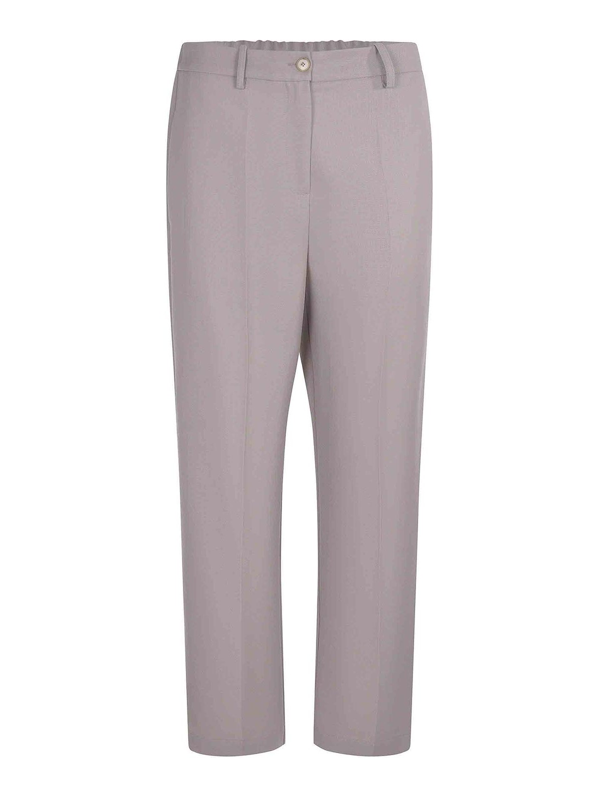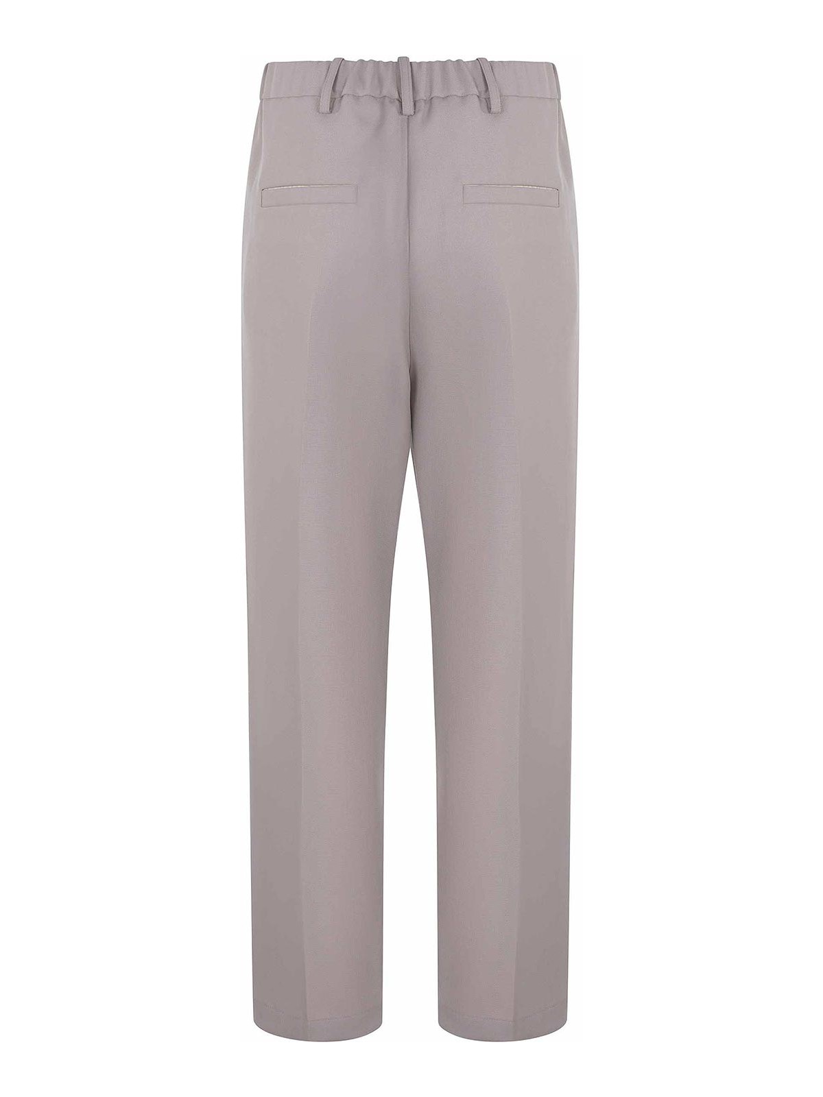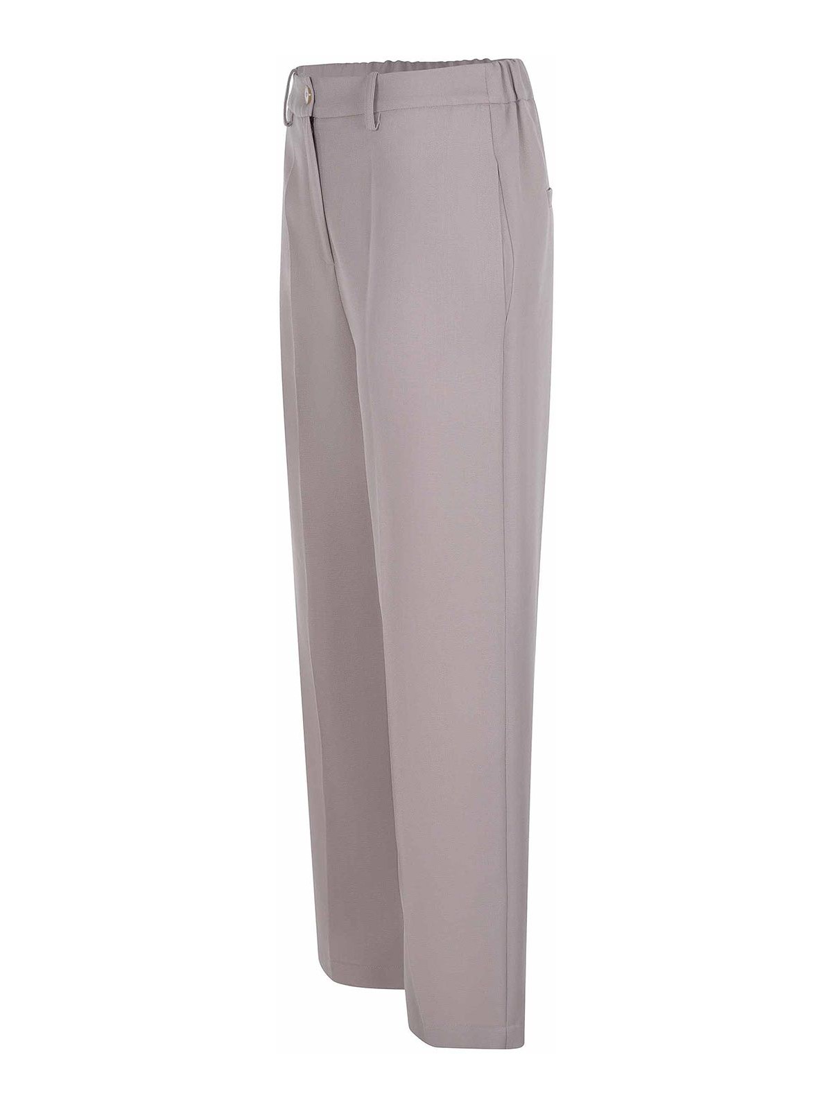 Pantalones Alysi confeccionados en mezcla de lana de color topo claro, cierre con cremallera y botón, trabillas, bolsillos laterales, elásticos en la parte trasera, bolsillos traseros, 55% lana virgen, 45% poliéster, fabricados en Italia.