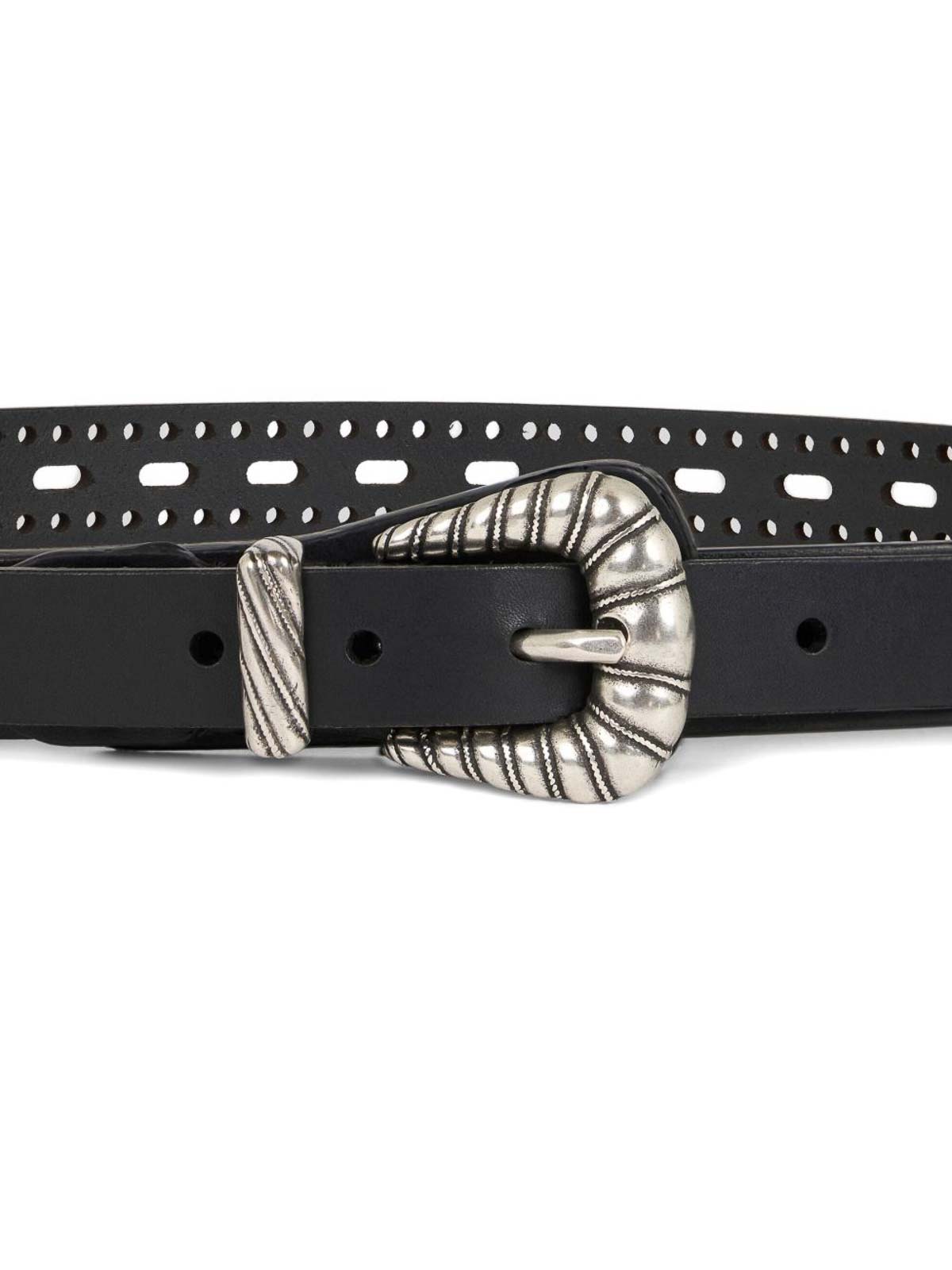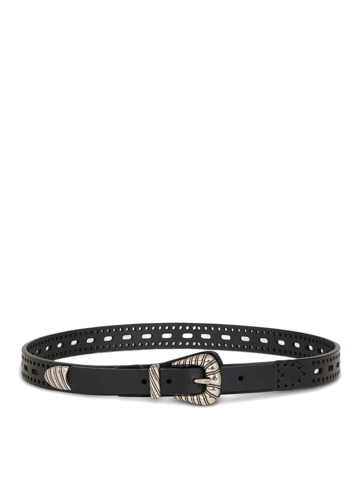 Cinturón de piel perforada, color negro, elementos metálicos con acabado y mano de obra grabados.