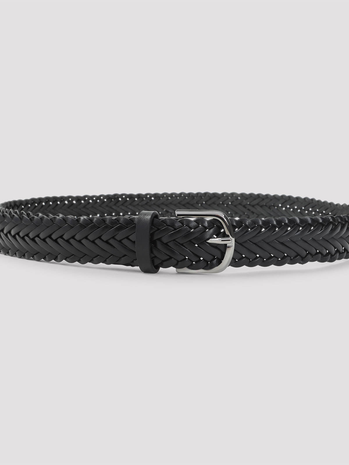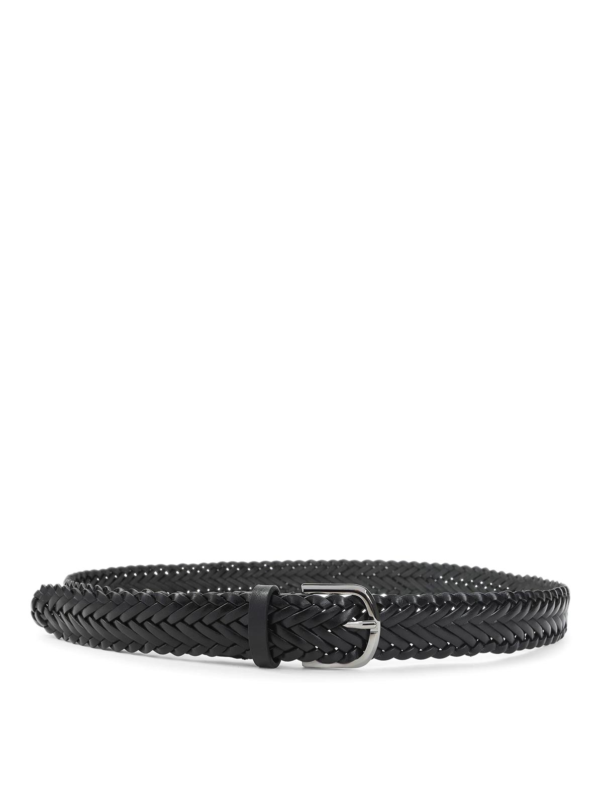 Cinturón de piel tejida negra Giorgio Armani. Piel tejida negra, trabilla de piel sencilla, cierre con hebilla plateada.