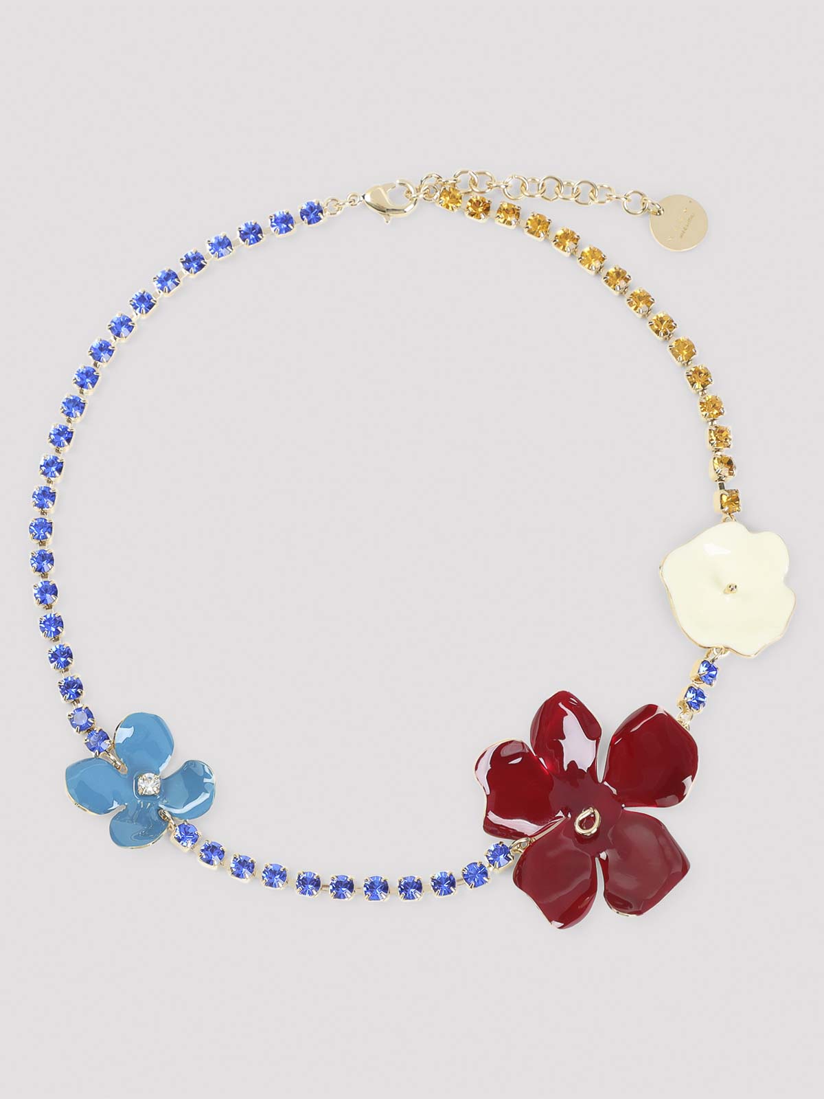 Collar de latón burdeos con flores de Marni. Collar de cadena con diamantes de imitación bicolor, con dijes florales blancos, burdeos y azul claro esmaltados a mano, acabado con un cierre ajustable con cierre de mosquetón.
