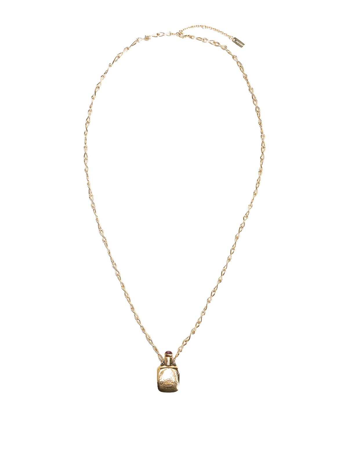 Collar con colgante Elixir de Chlo en estilo vintage con un vial cuadrado ornamental engastado en una cadena sin fin, una piedra adorna la tapa y el logotipo de Chlo grabado