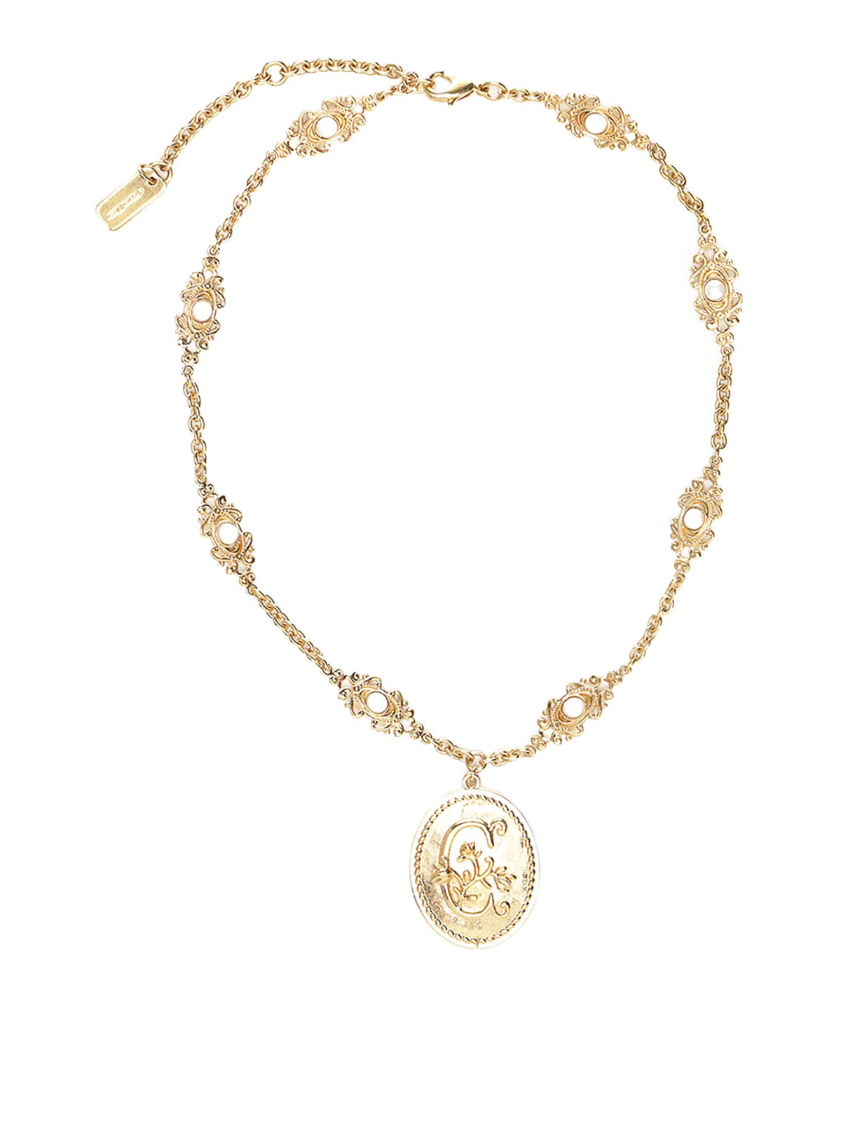 Collar vintage de latón dorado Chateau Treasures con medalla C floral de doble cara en una cadena