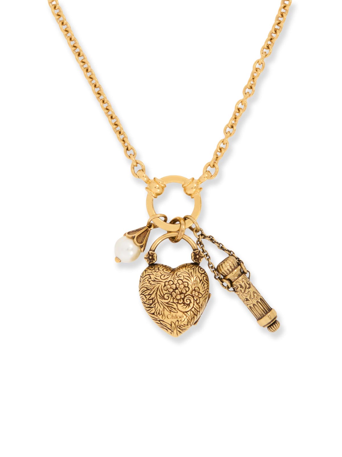 Cierre ajustable con gancho, tres colgantes en forma de corazón, vial ornamental y perla de cristal, placa con el logotipo en la parte posterior, hecha en Italia, latón