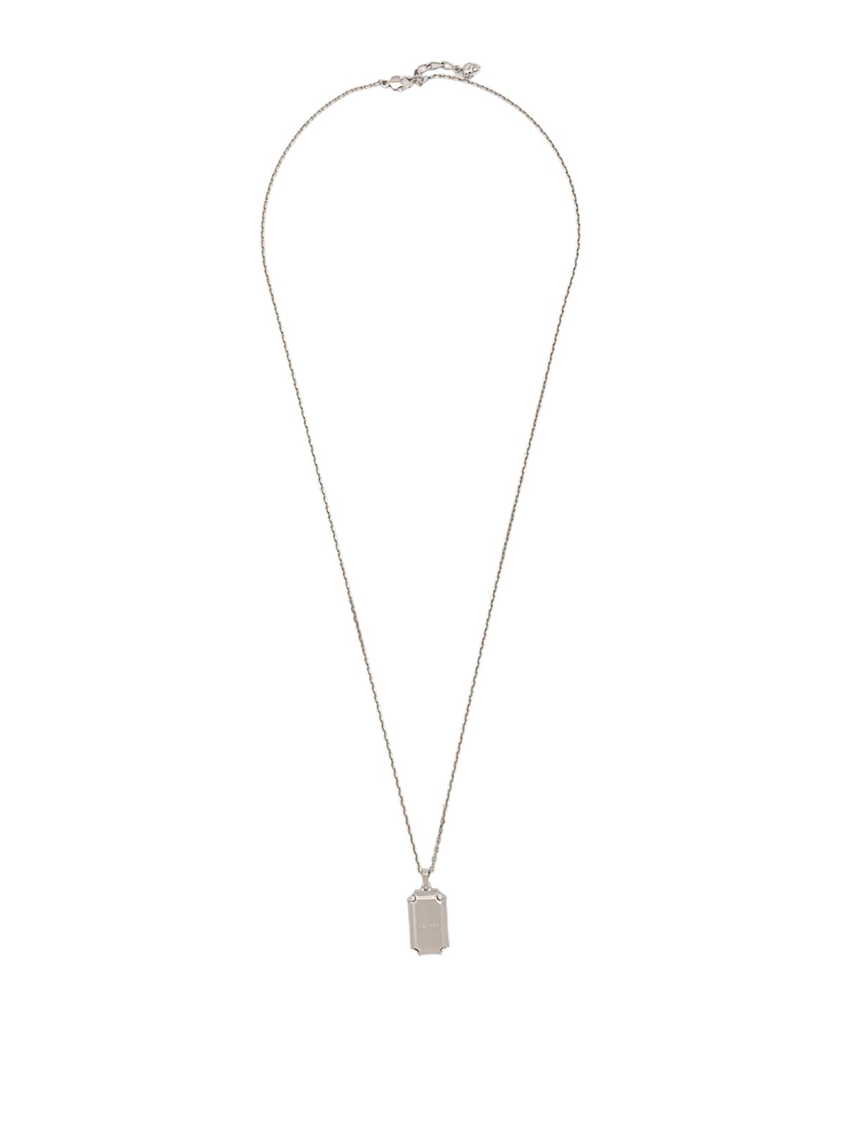 Cadena colgante rectangular en tono plateado, logotipo grabado con detalles de eslabones
