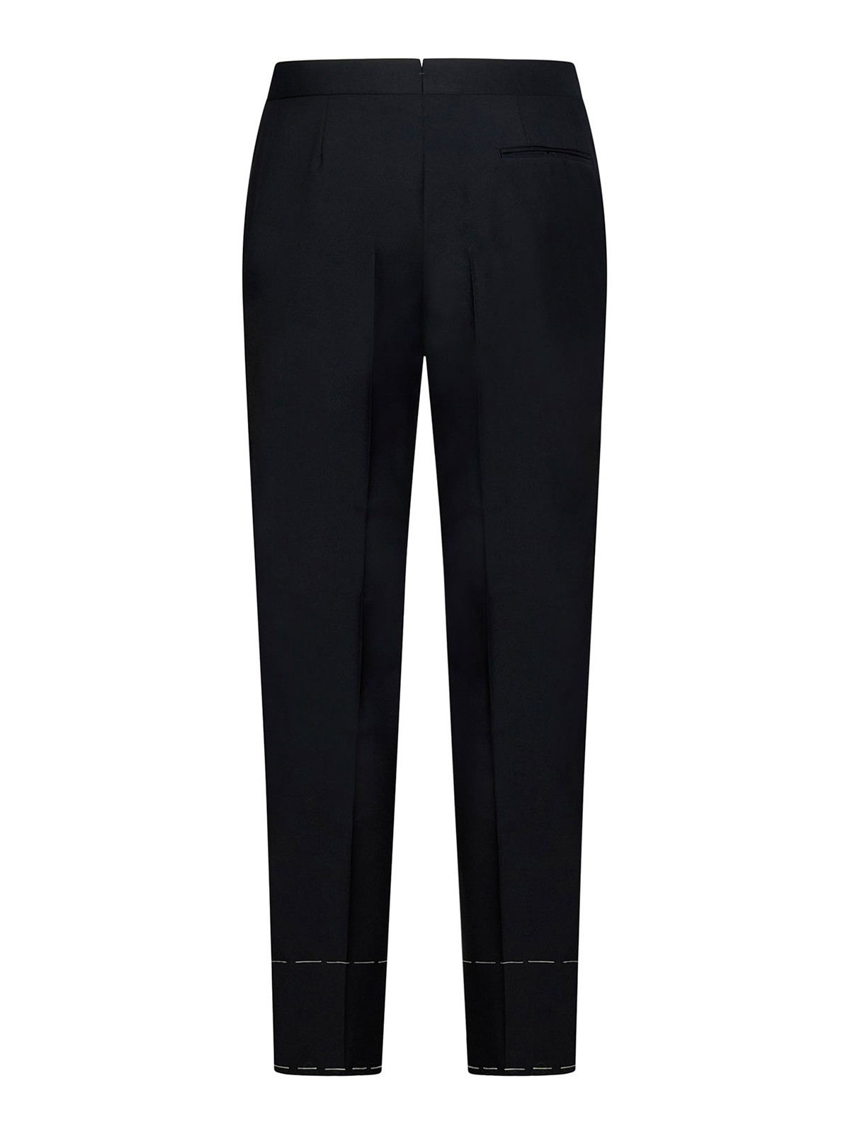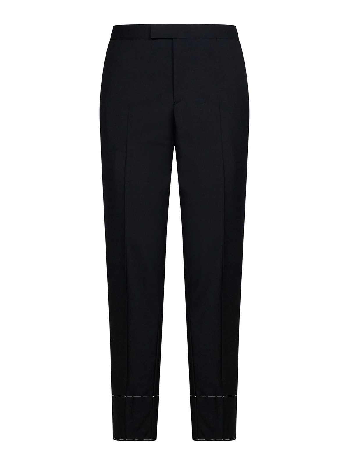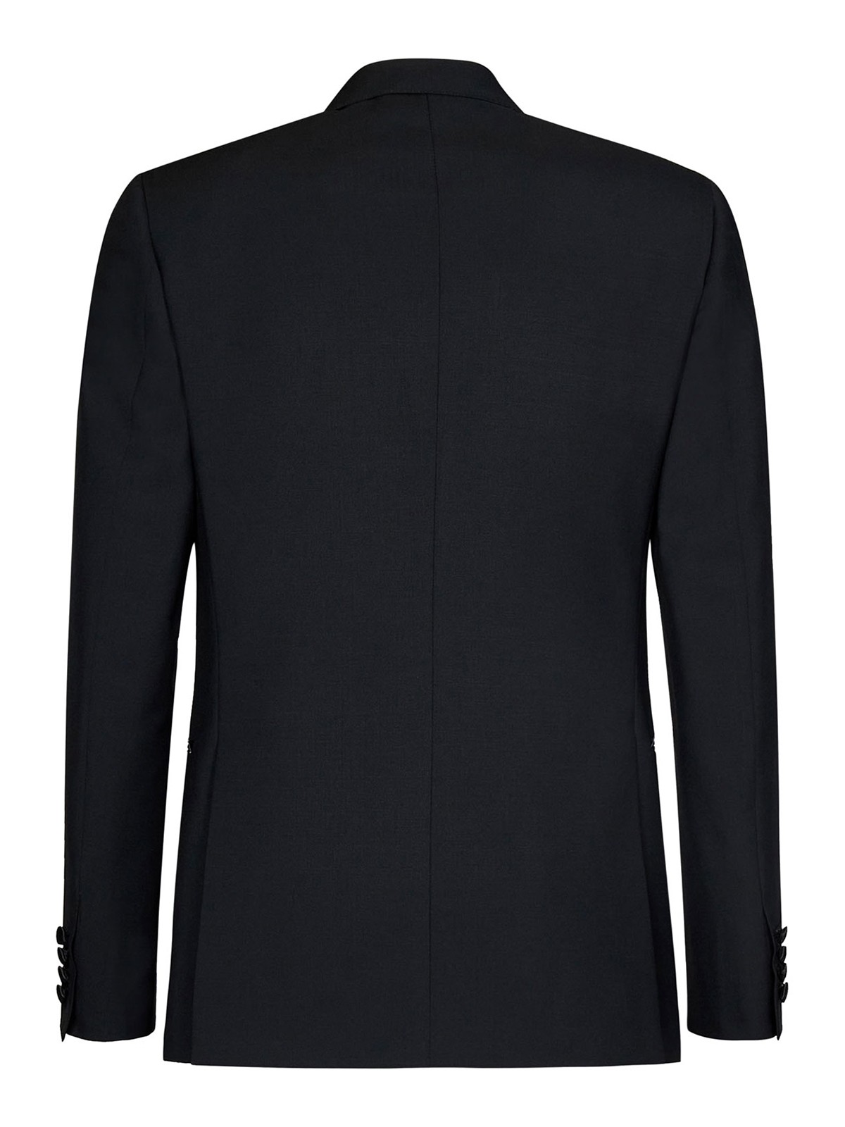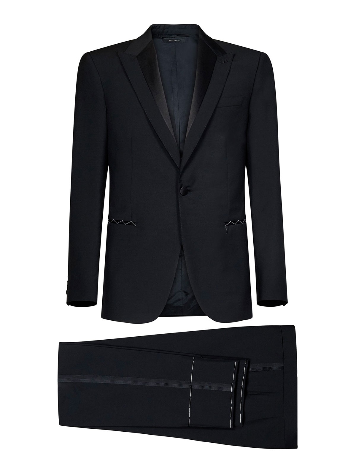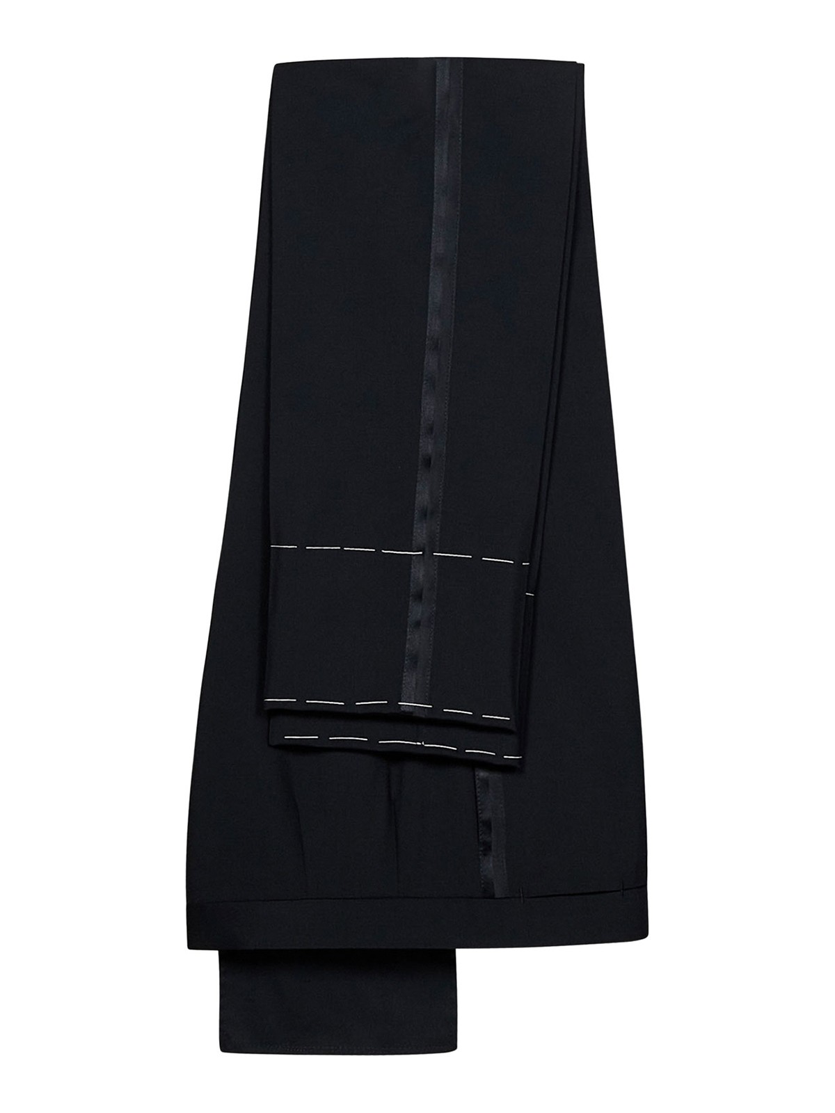 Blazer de un solo pecho, cierre frontal con un botón, solapa clásica con inserto de satén negro, bolsillos laterales ribeteados en satén, bolsillo ribeteado en el pecho; puños con botones, doble abertura en la parte trasera; interior parcialmente forrado; pantalones interiores parcialmente forrados: cierre frontal oculto en la cintura con trabillas para el cinturón, bolsillos laterales, bolsillo ribeteado en la parte trasera brotes en la parte delantera, bandas de satén negro en los laterales, negras