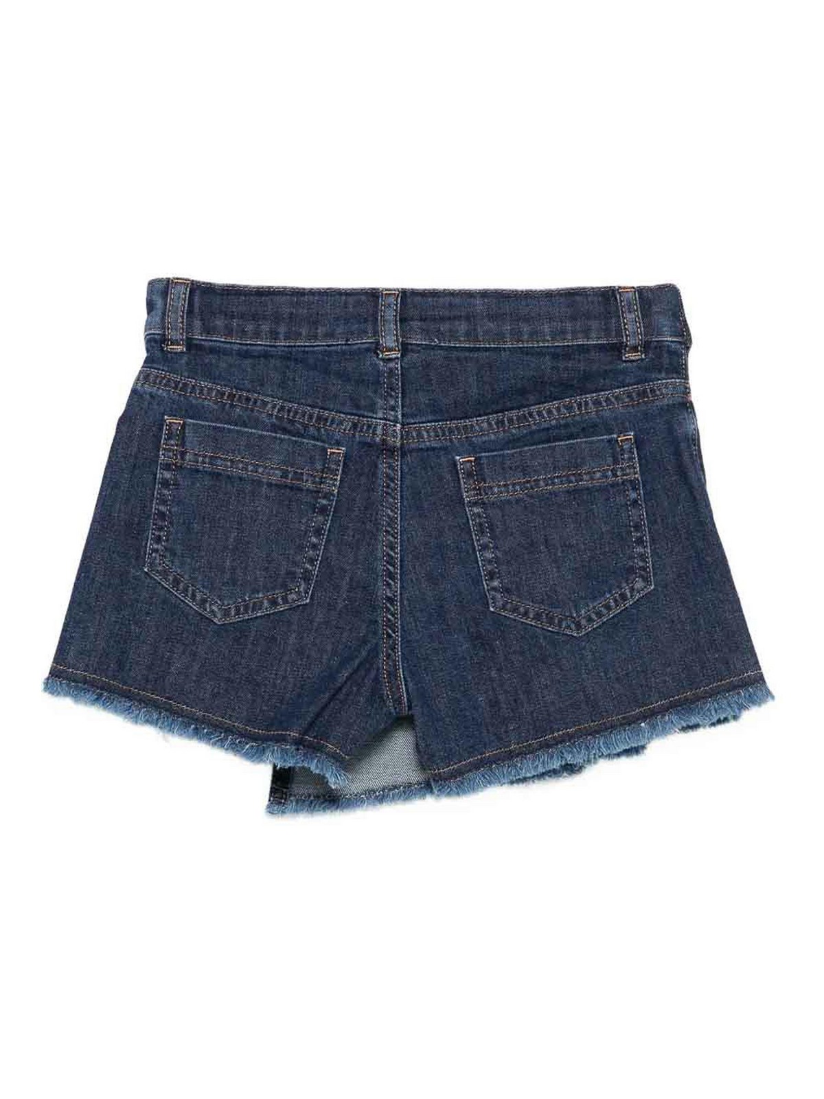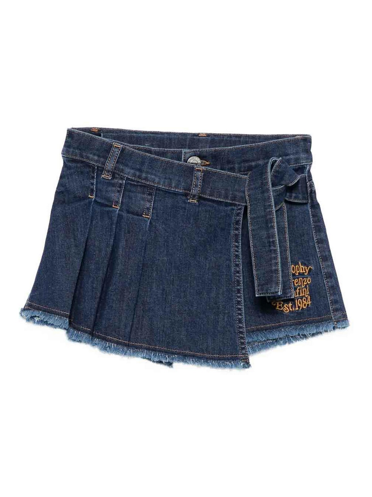 La falda de mezclilla plisada presenta un diseño plisado azul con dobladillo con flecos y trabillas para cinturón.