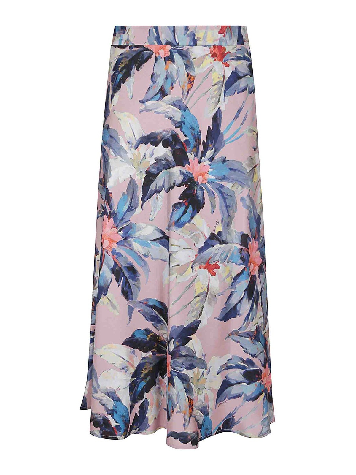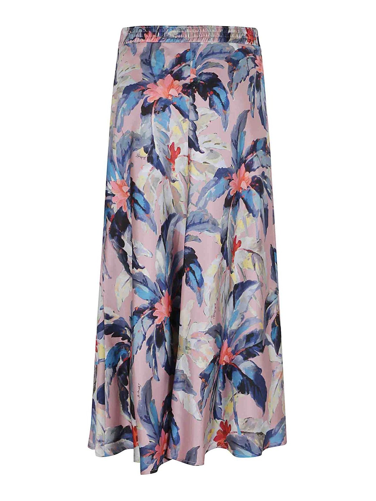 Falda de sarga de seda frente al mar. Cintura baja, forro en contraste, cierre con cremallera, silueta acampanada, diseño de longuette, libertad de movimiento y practicidad, adornada con un estampado Antasia Tropicana Lago di Como.
