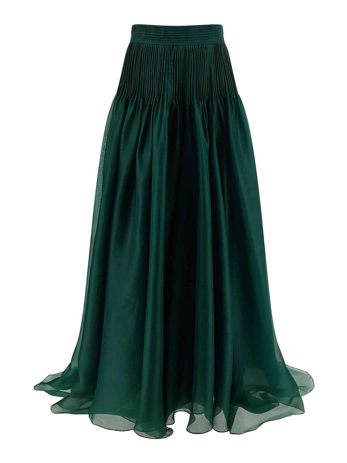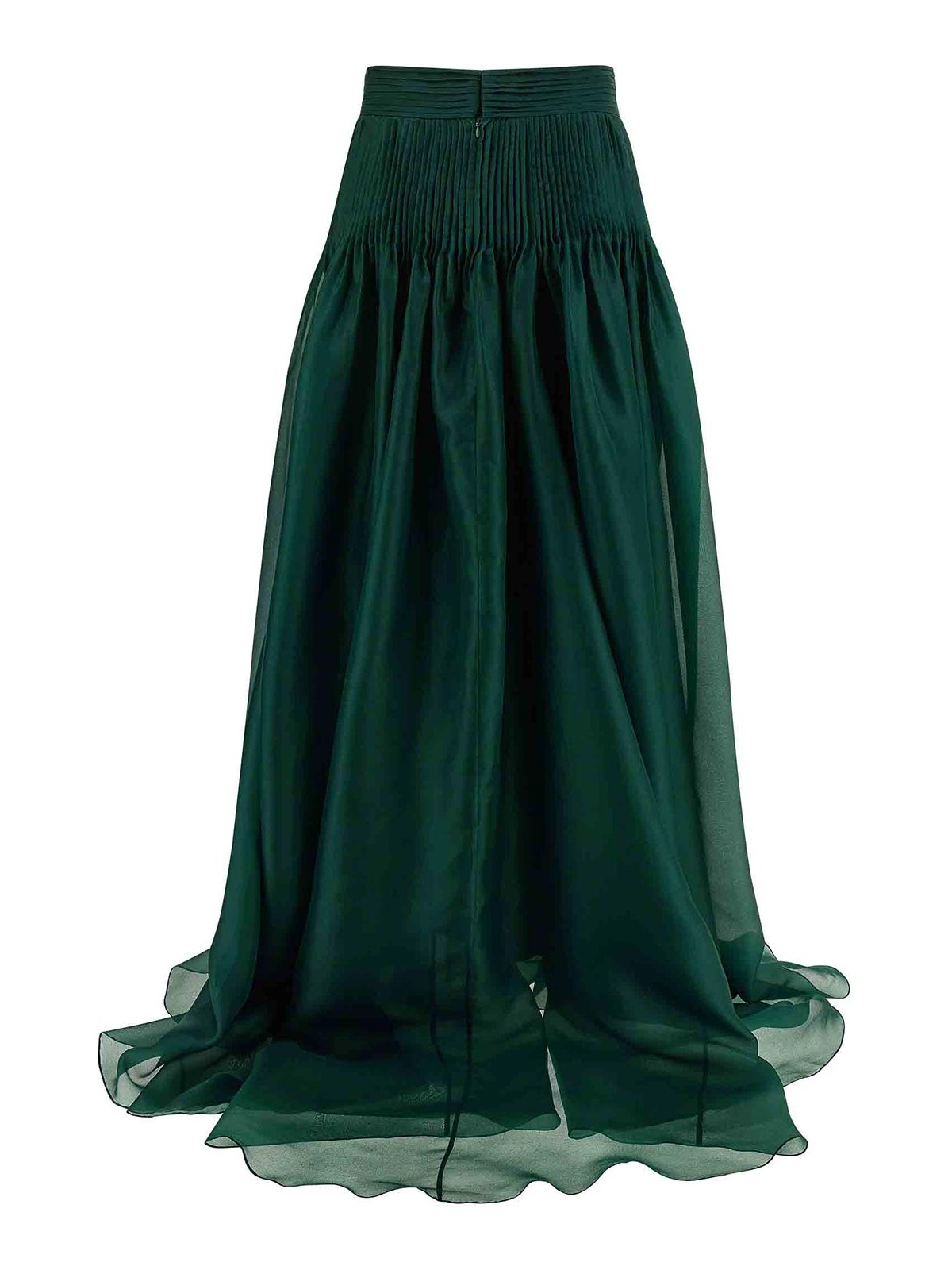 falda larga de organza en organza transparente, pliegues en la cintura, silueta voluminosa y ondulante con cremallera trasera en cintura alta