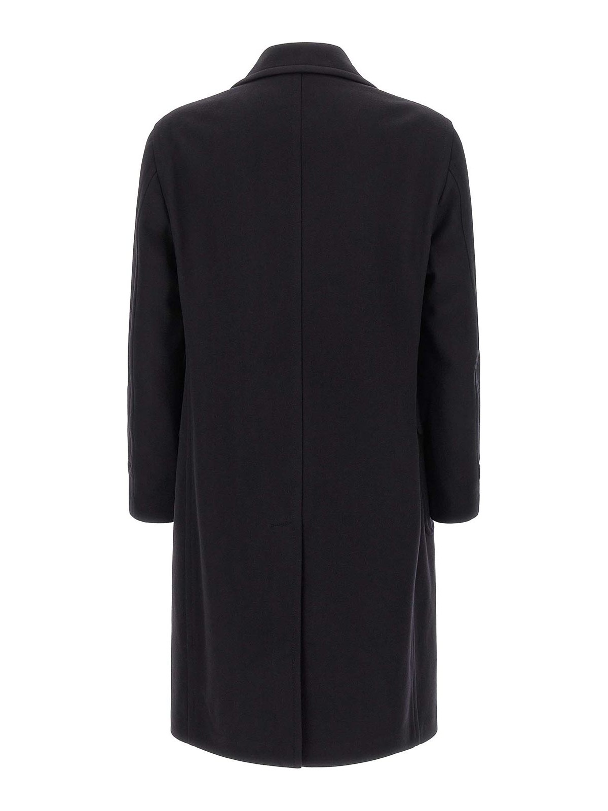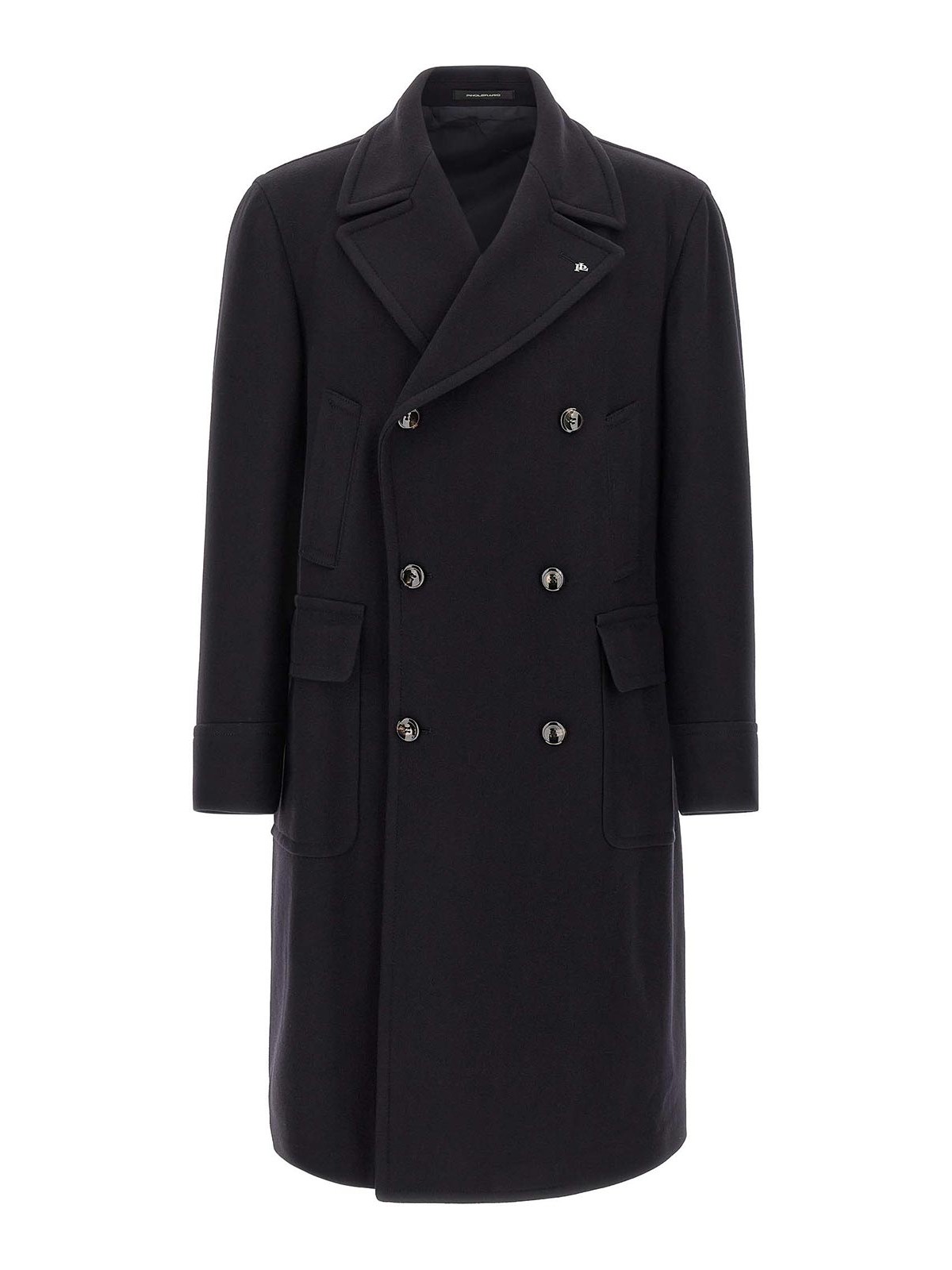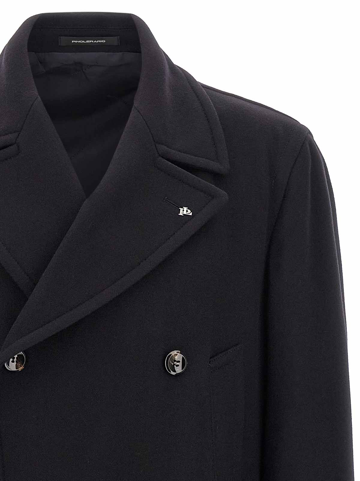 Abrigo midi cruzado en mezcla de lana de jerez y cachemir con cierre con botones en la parte delantera, cuello con inserto de piel en la parte trasera, solapas de espejo con broche metálico extraíble, bolsillos, mangas largas, hombros estructurados, abertura en la espalda, forro con monograma de medio cupro y dos bolsillos interiores. Las prendas de la línea «pino lerario» utilizan tejidos creados exclusivamente para talladores.