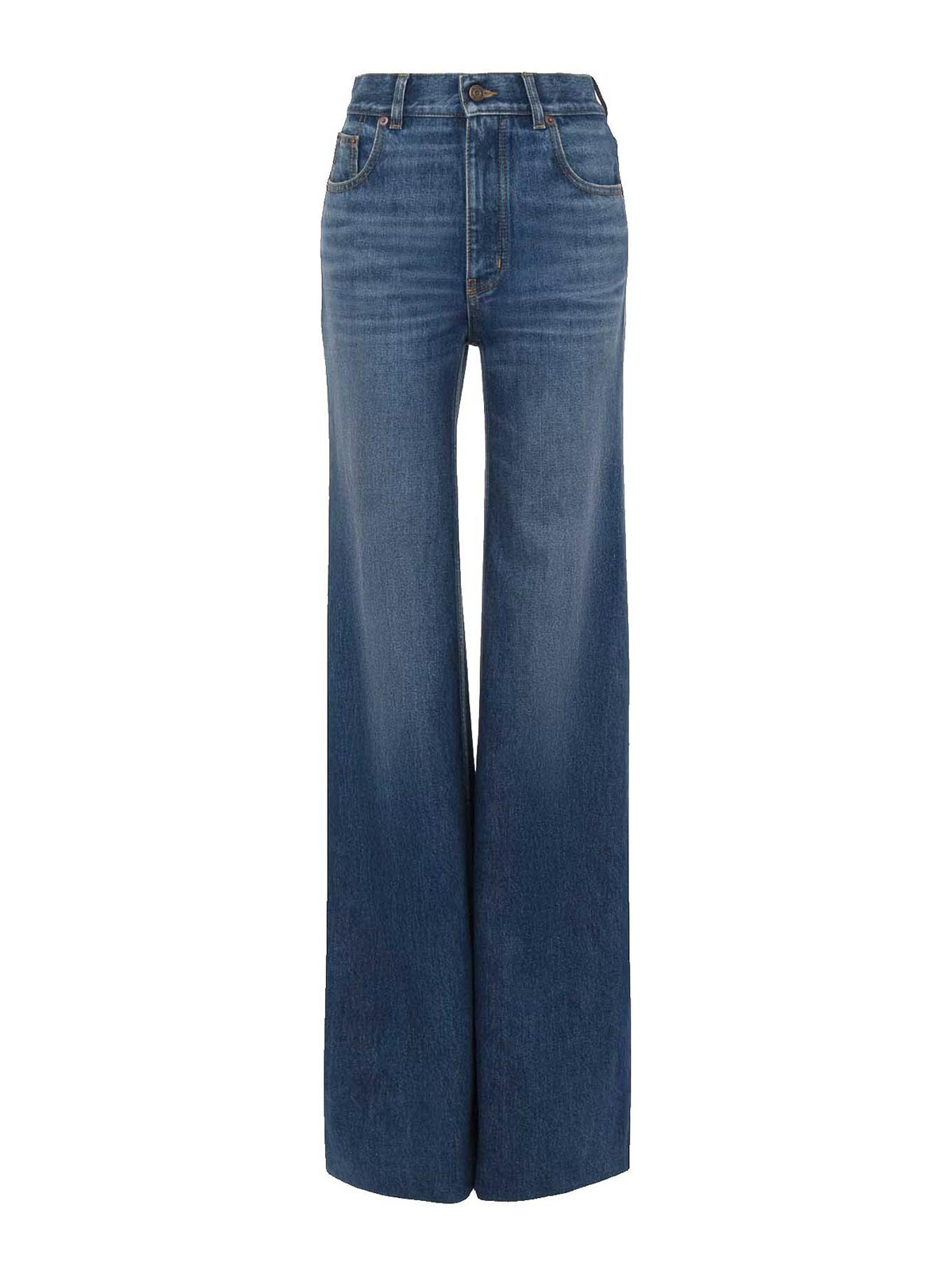 confeccionado en mezclilla de algodón orgánico, cintura alta con rasgaduras, cierre con cremallera y botón, parche de piel con el logotipo en la parte posterior, fabricado en Italia, la talla que se muestra en la foto es 25, color del diseñador: azul brumoso