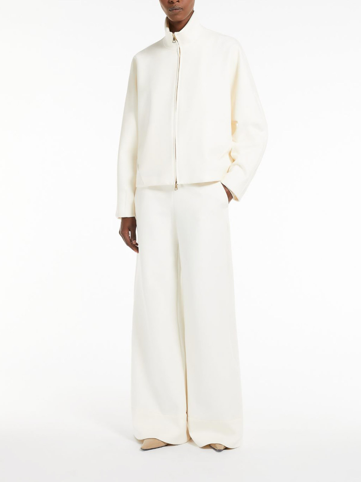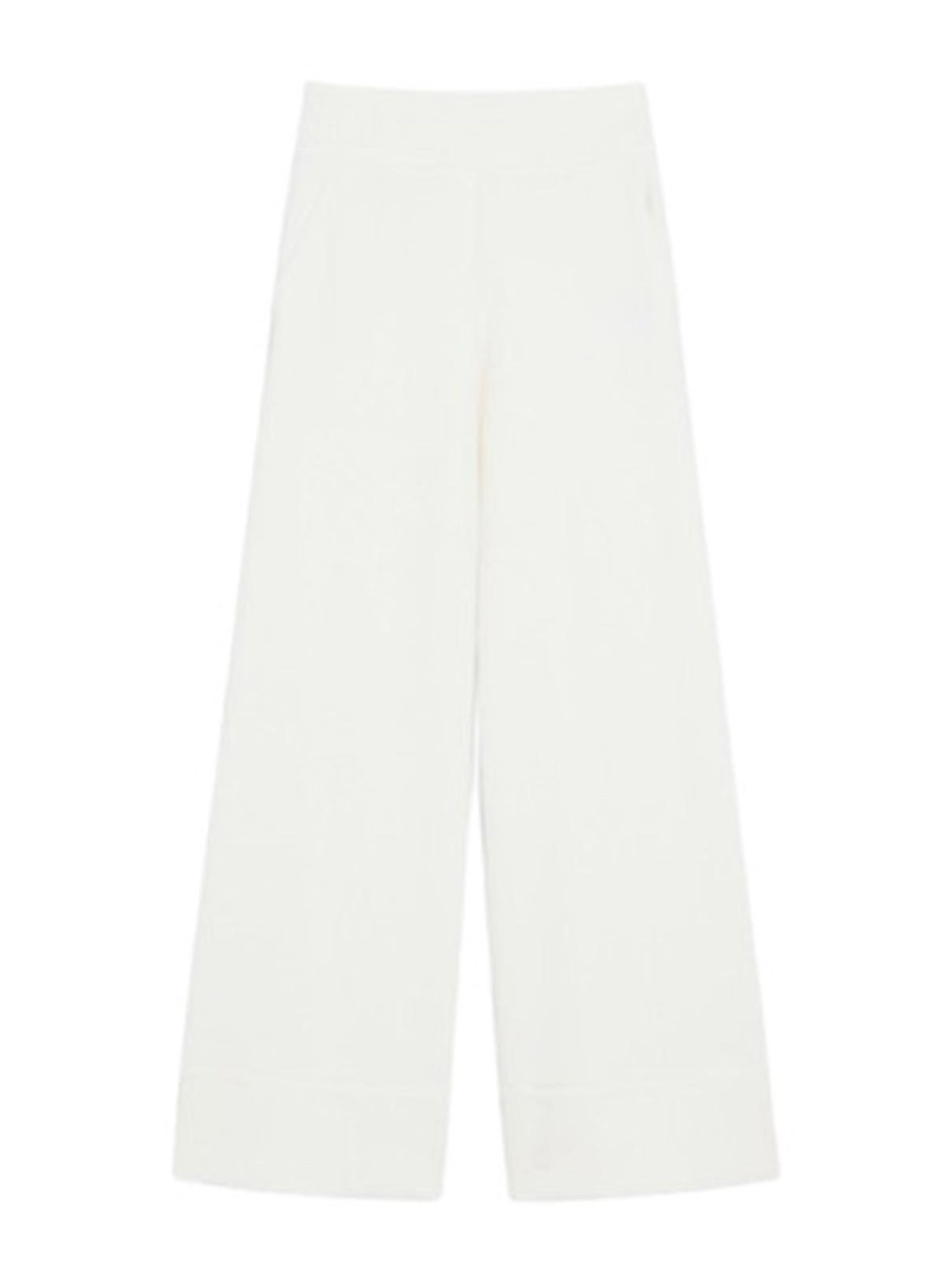 Pantalones largos de suave punto técnico, con una silueta de cintura regular y pernera ancha acampanada, dobladillo alto en la parte inferior y bolsillos franceses en los laterales. Acabado con bolsillos ribeteados en la parte posterior, acabado interno en cinta con el logotipo y detalles cosidos a mano. Cierre con correa de cintura alta y cremallera lateral.
