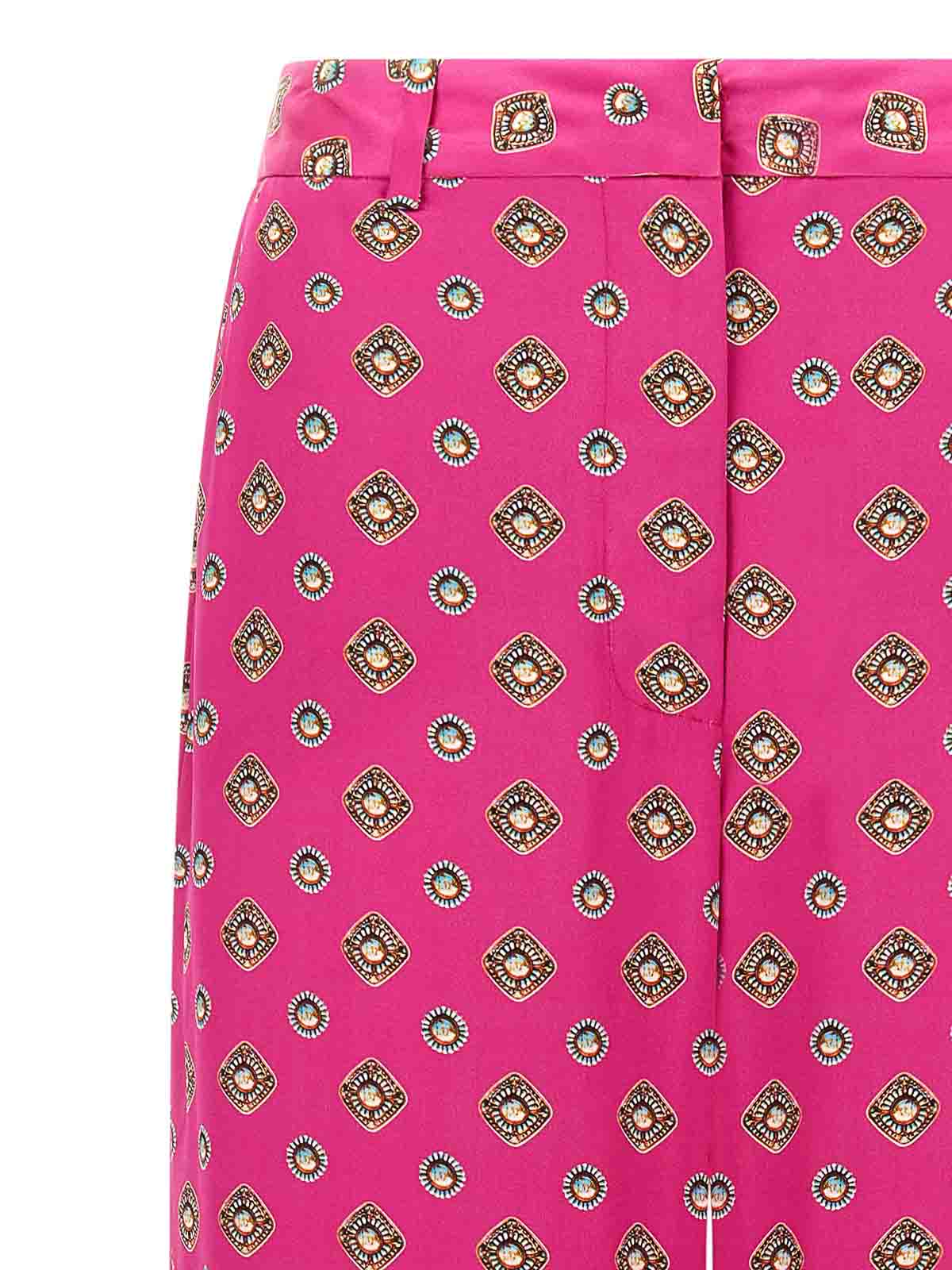 pantalones de seda tipo pilar con estampado charmeuse de inspiración suroccidental, pernera ancha acampanada, cintura alta, cierre con cremallera con velcro y botones, bolsillos.
