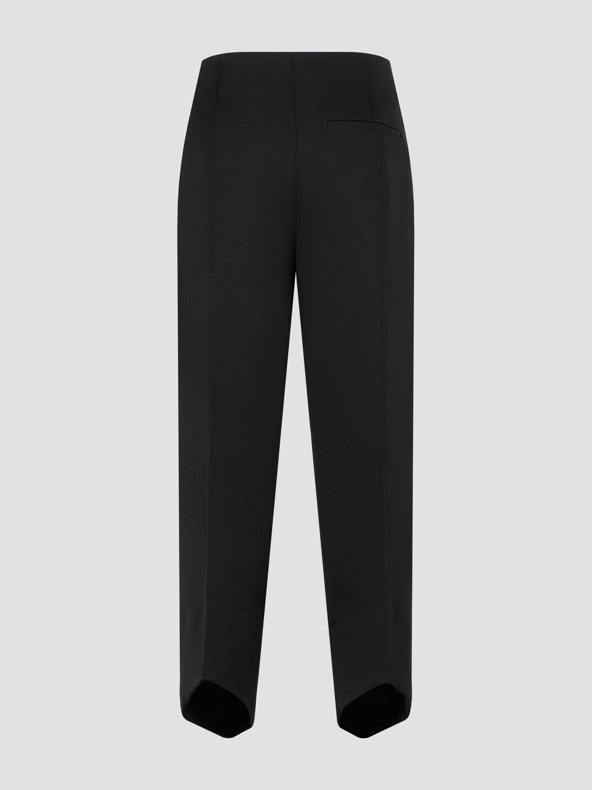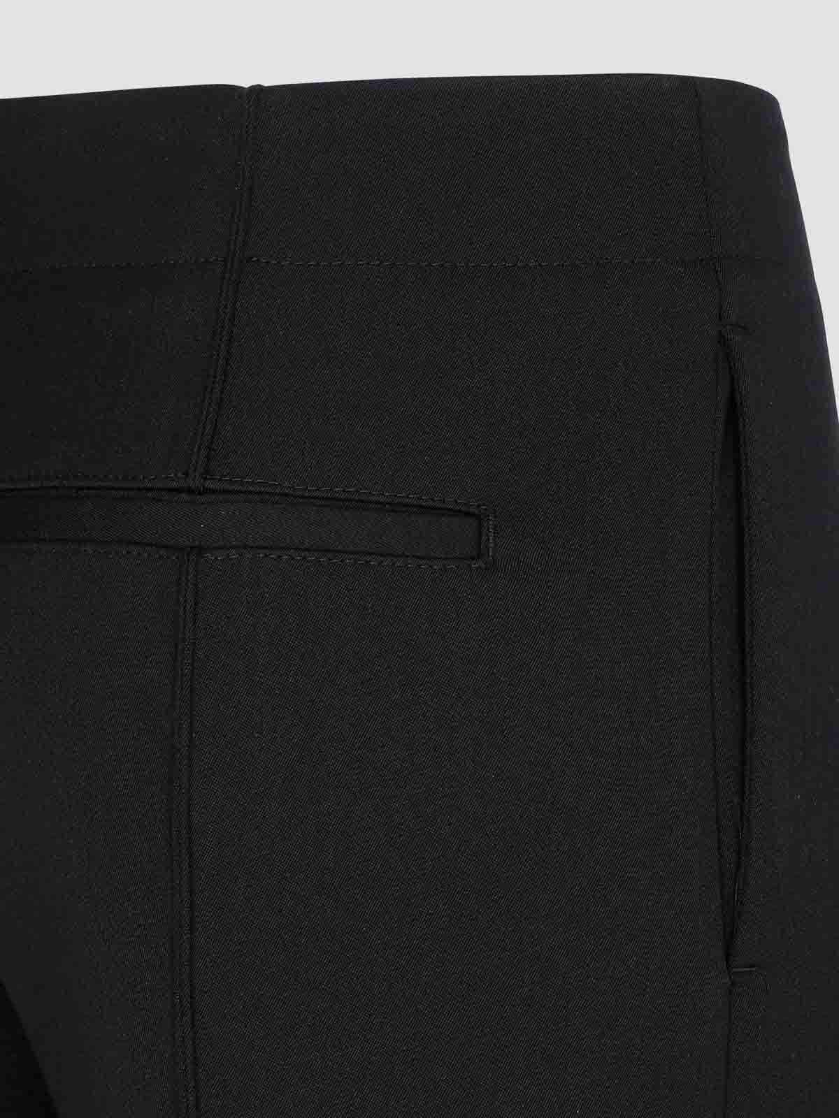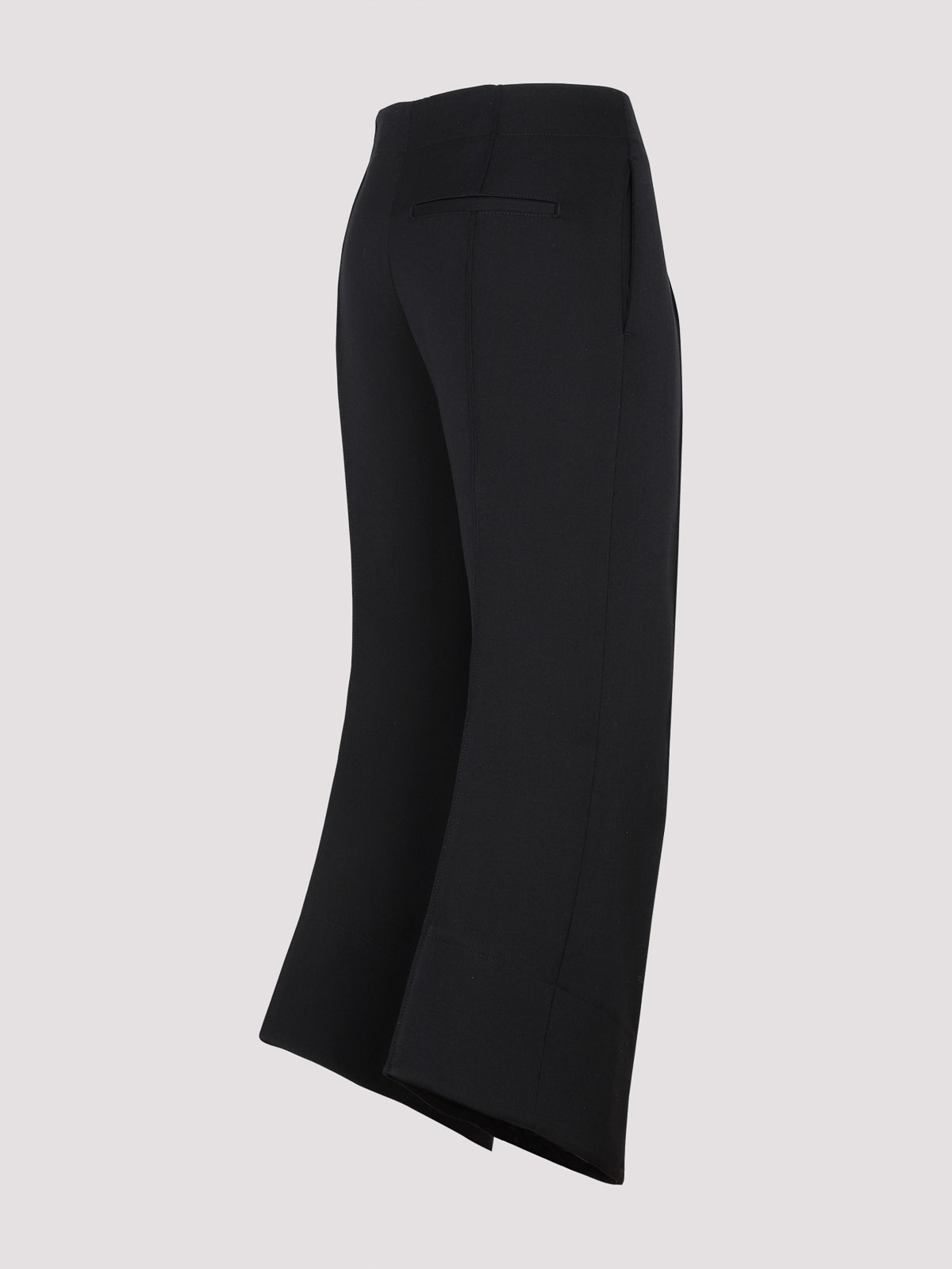 Pantalón Bottega Veneta de lana negra con forma curva. Confeccionado en pura lana negra con forro de algodón. Pernera corta, forma curva, dobladillo asimétrico esculpido, cierre de cremallera oculta con gancho, dos bolsillos laterales y bolsillo con abertura trasera.