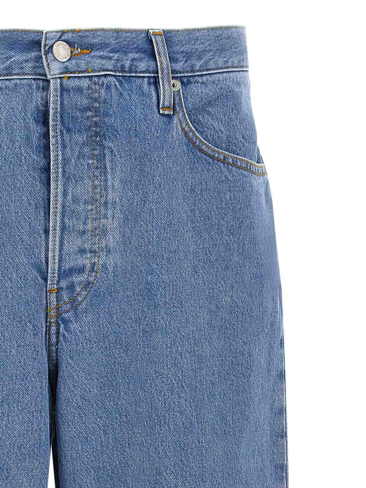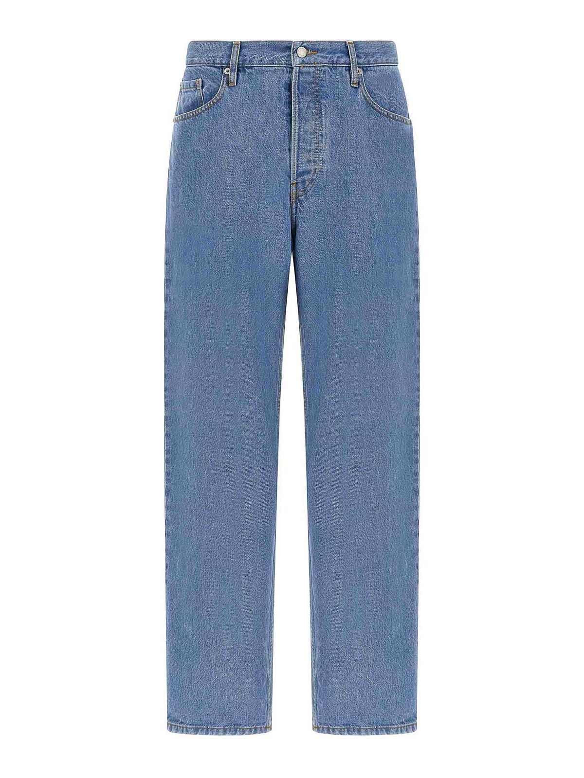 Vaqueros vaqueros de algodón de cintura media con pernera recta y ancha, cierre con botones, cinco bolsillos y etiqueta de piel con el logotipo en la parte trasera.