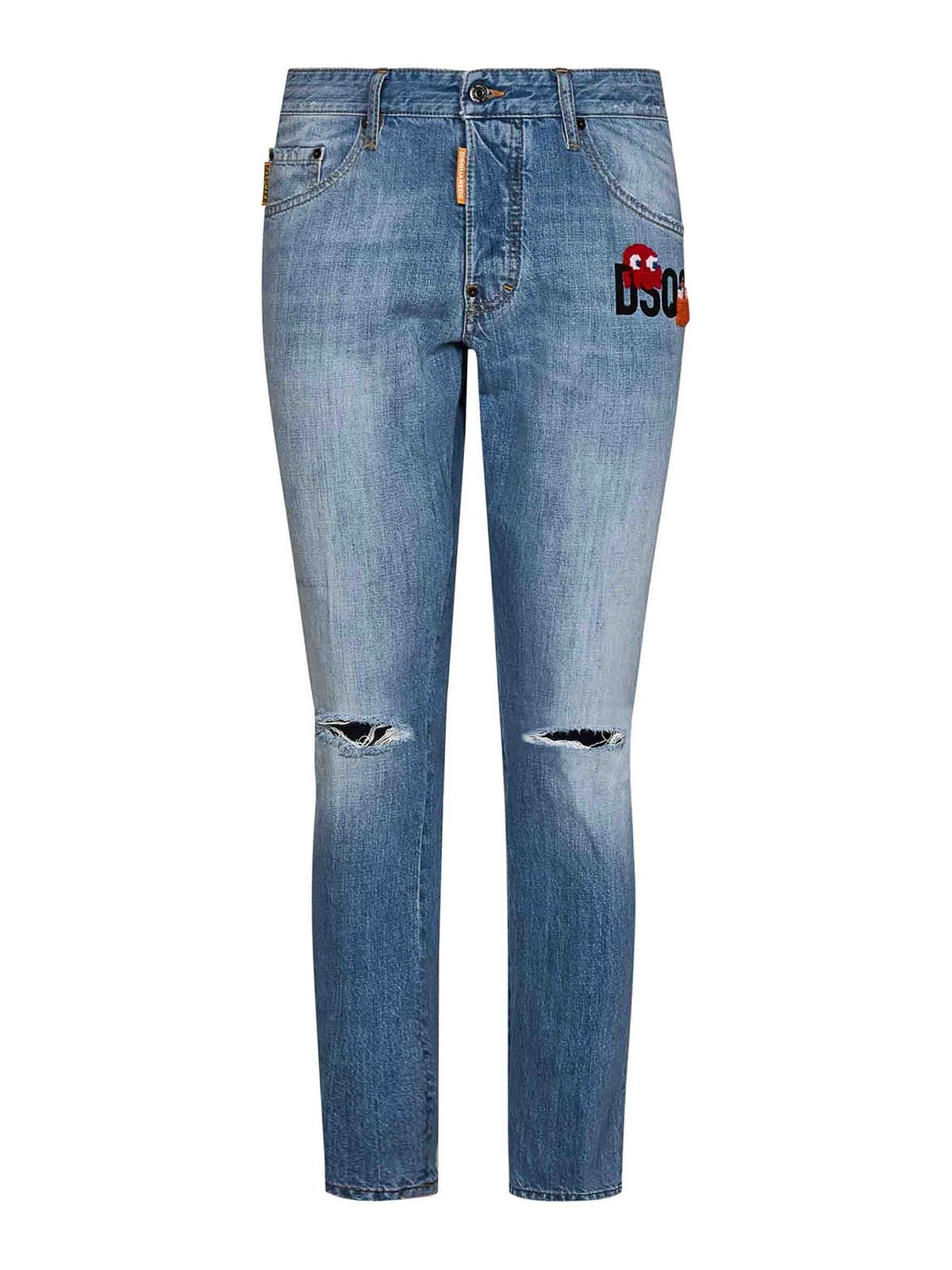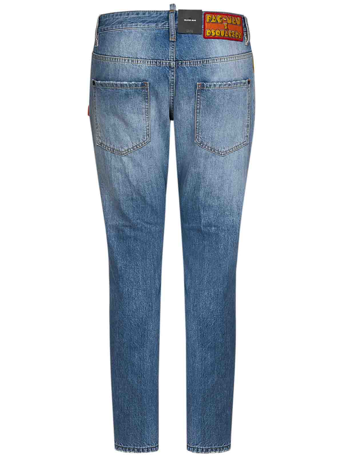 Cintura cerrada con botones y trabillas para el cinturón, diseño de cinco bolsillos, etiqueta con el logotipo naranja en y en la parte trasera lateral, parche cuadrado de pac-man x D, letras cuadradas en contraste con parches de pac-man bordados en las rodillas rotas, utilizado con un corte ajustado destruido, el azul de la foto corresponde a un
