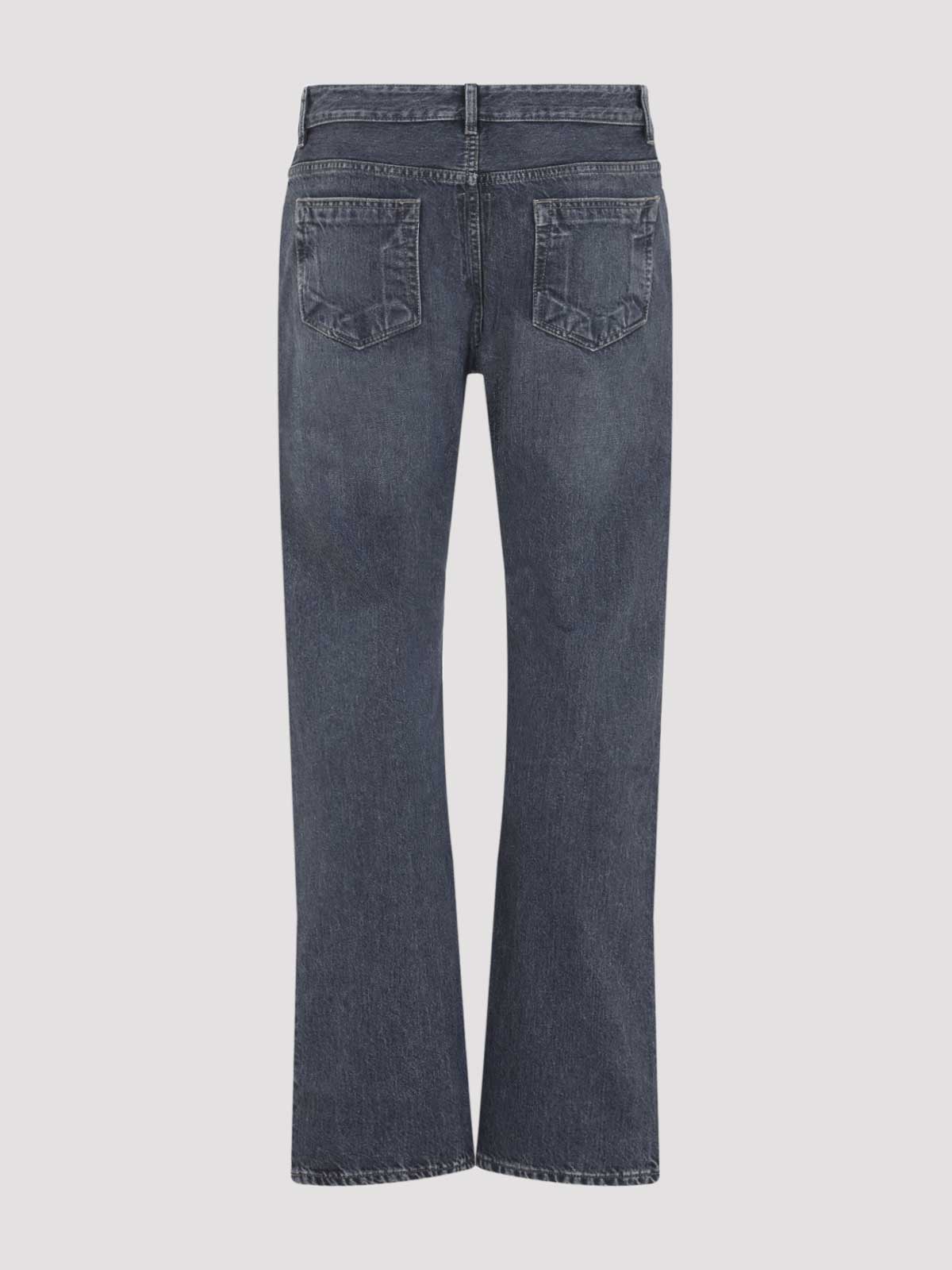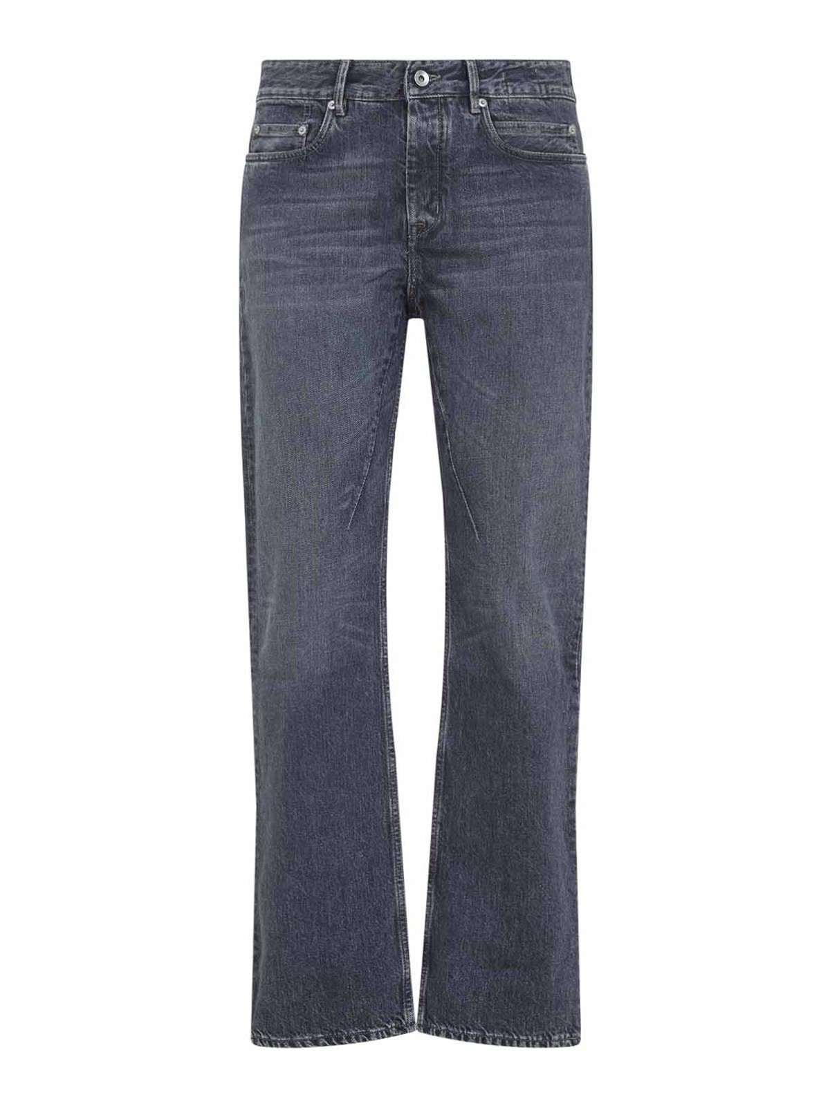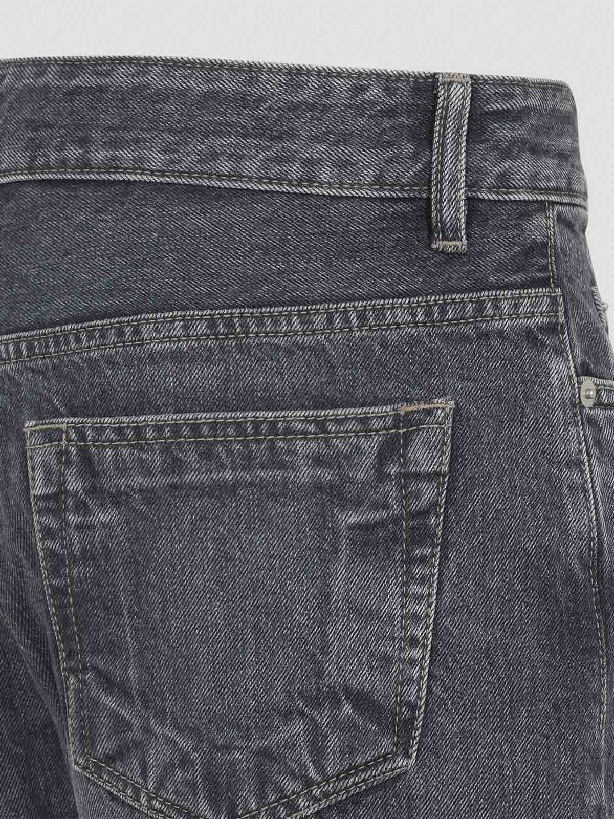 Vaqueros de algodón gris con corte antiniebla Drkshdw de Rick Owens. Vaqueros de algodón gris lavado a la piedra, talle bajo, trabillas para el cinturón, diseño de 6 bolsillos, remaches plateados en la parte delantera, cierre frontal con botones y cremallera, corte regular.