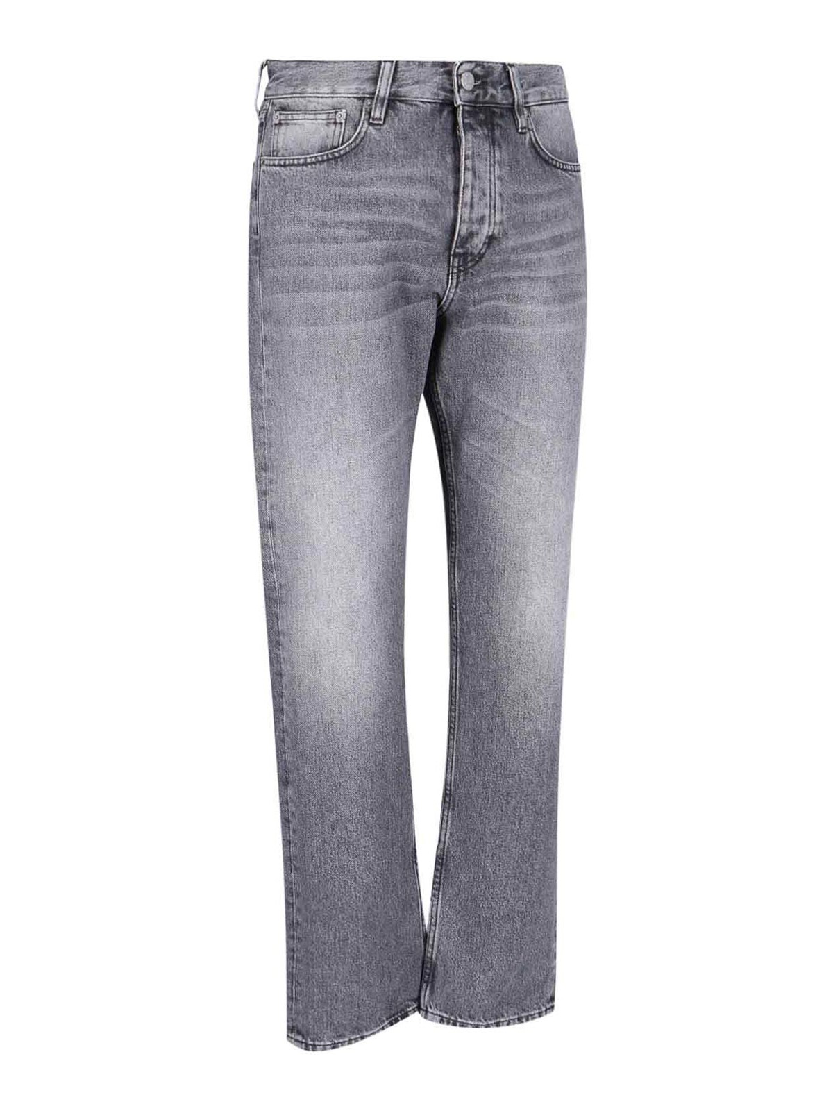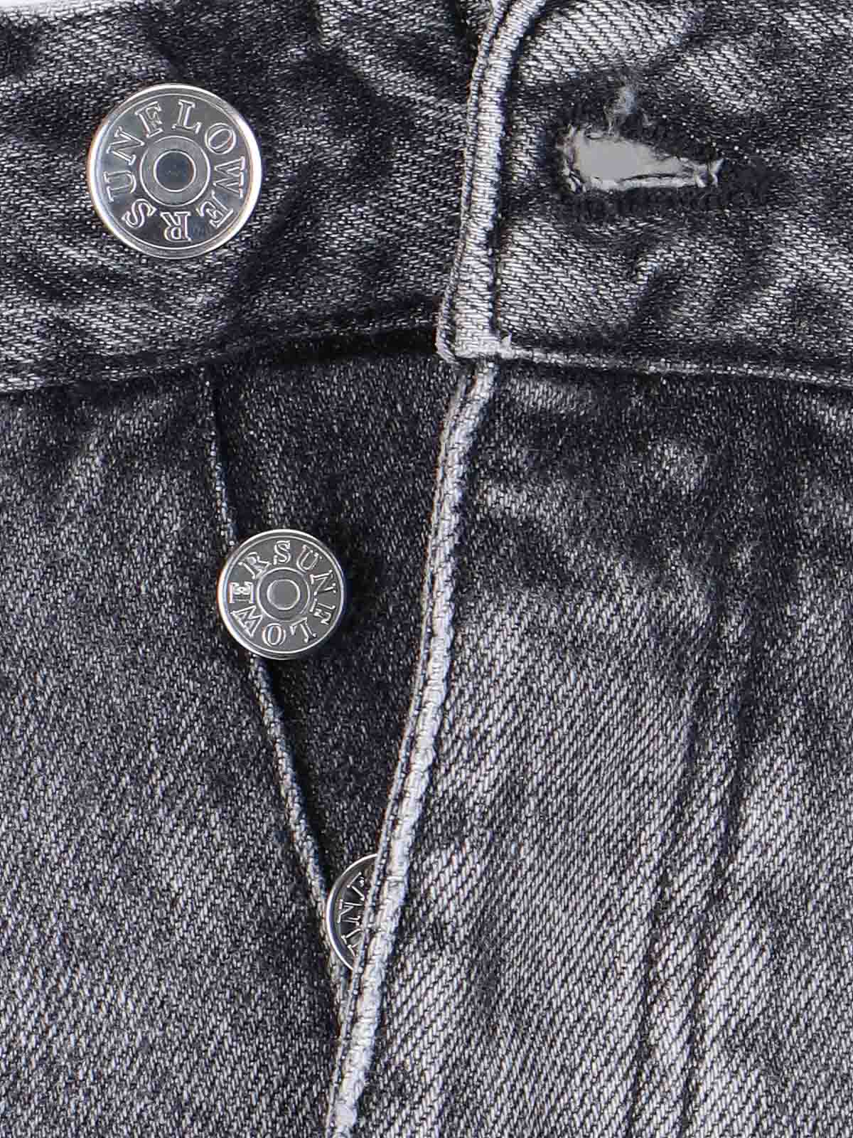Vaqueros de pierna recta tipo girasol en mezclilla gris, detalles desgastados, cintura mediana, trabillas, cierre con botones, diseño de cinco bolsillos