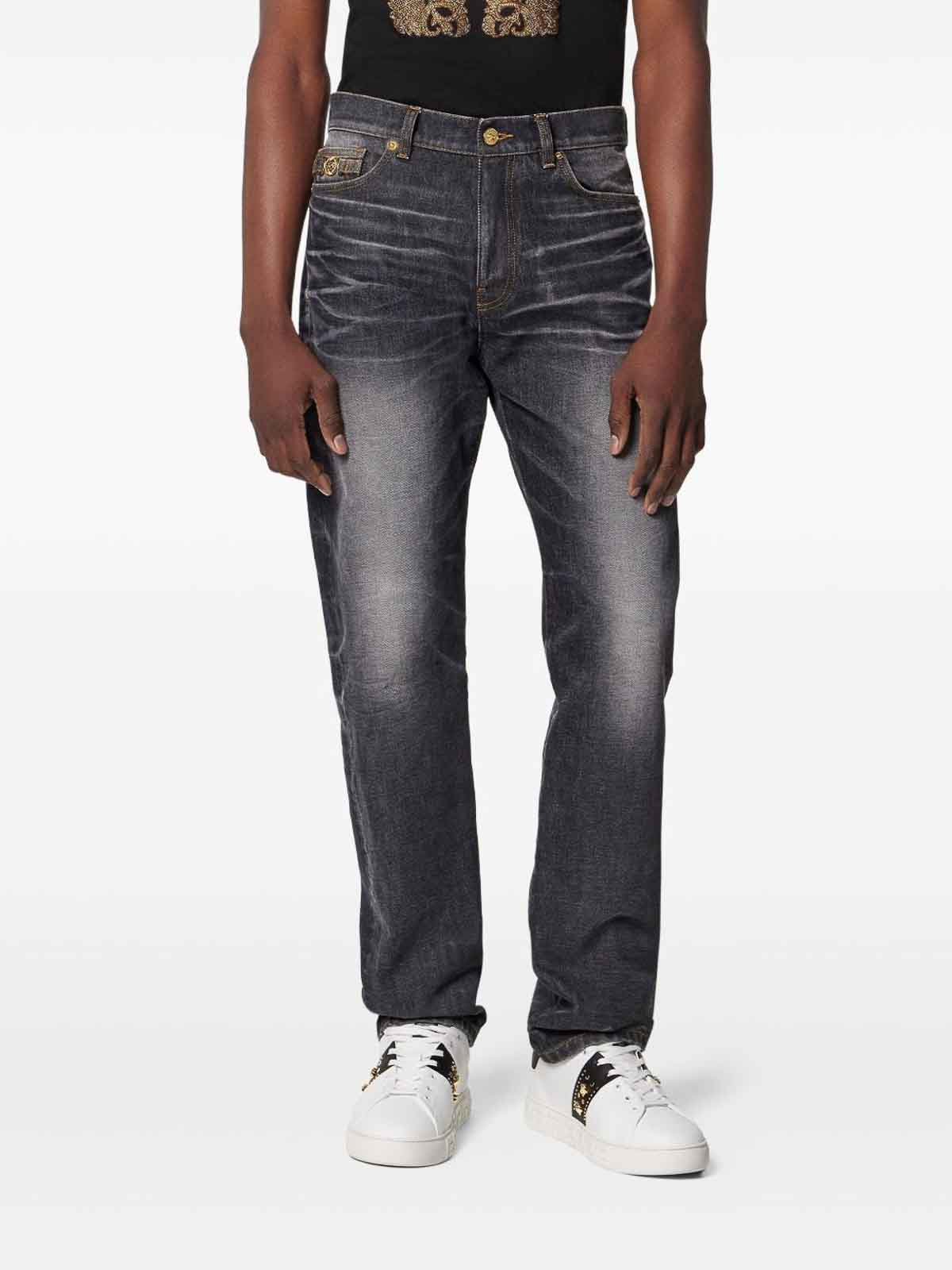 Los vaqueros Versace negros, con un diseño clásico de cinco bolsillos con cierre de cremallera y botón ocultos, presentan un icónico motivo de cabeza de medusa y un parche con el logotipo en la espalda que le da un toque distintivo, vaqueros Versace, medusa big, negros, cierre oculto con cremallera y botón, diseño de cinco bolsillos, motivo de cabeza de medusa, parche con el logotipo en la espalda
