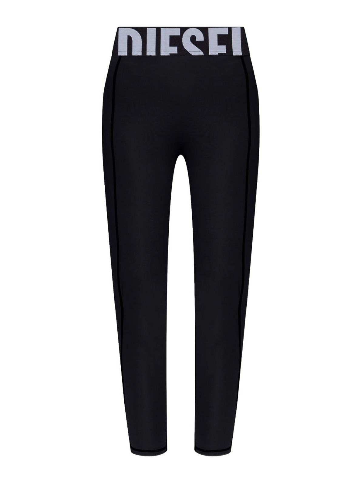 Cinturilla negra con logotipo, cintura alta ajustada, detalle de costura hasta el tobillo