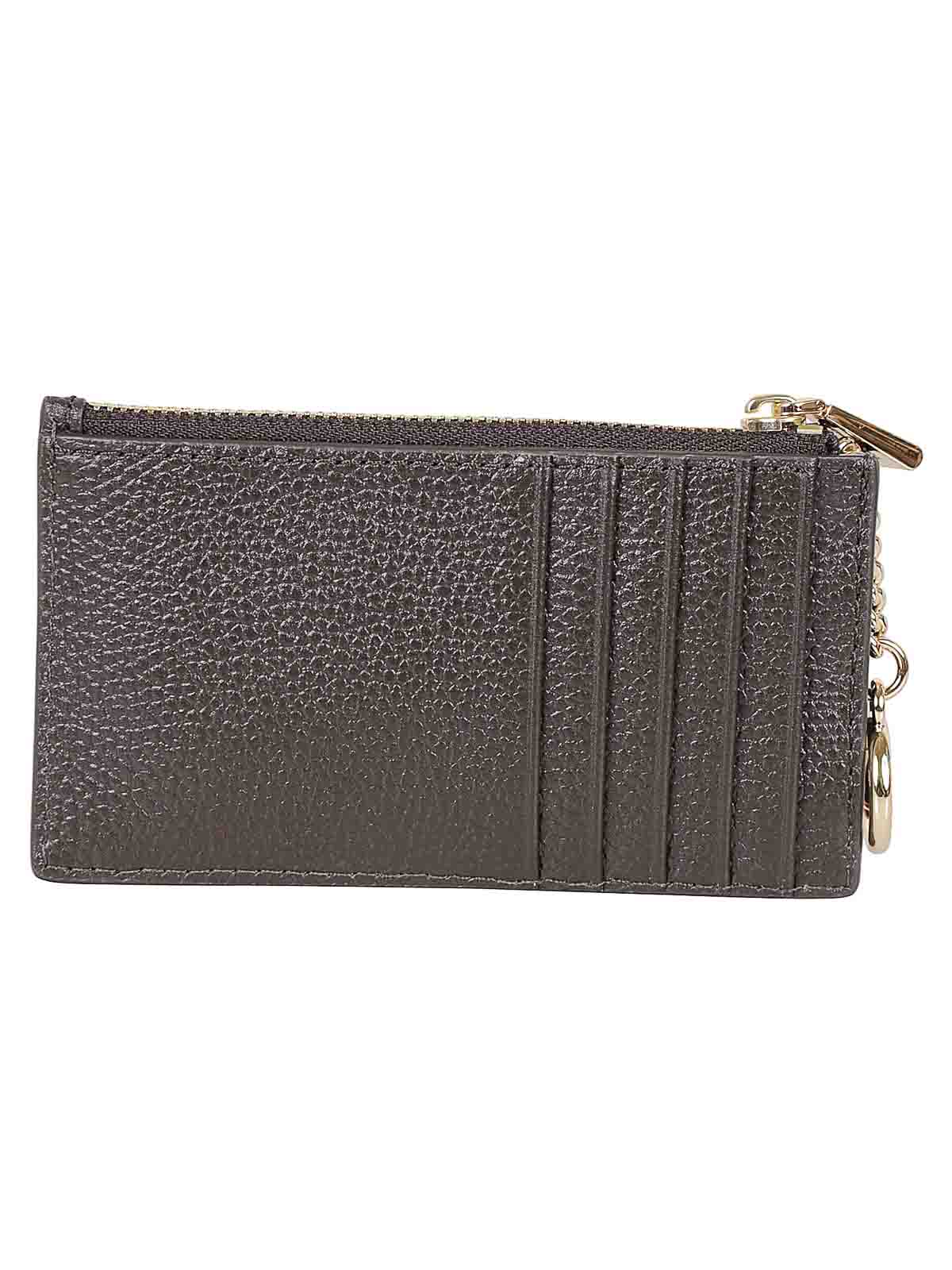 Cartera de piel texturizada de color chocolate, piezas metálicas doradas, un monedero cerrado con cremallera, llavero metálico, un compartimento frontal externo y cinco ranuras traseras para tarjetas.
