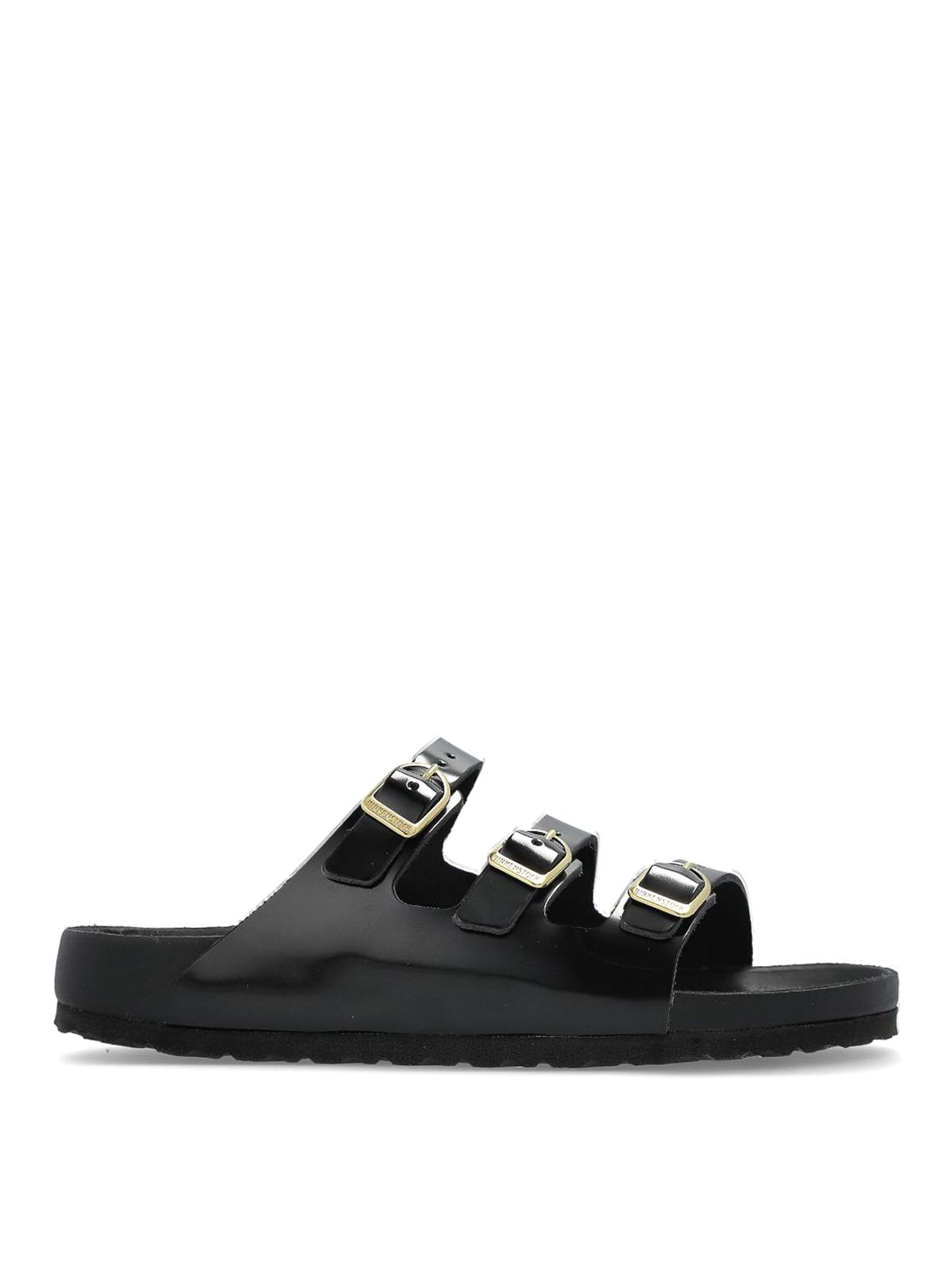 zapatillas de piel negras florida de birkenstock con cierre de hebilla estilo slip-on, suela de goma con punta abierta, birkenstock, zapatillas «florida», negras, cierre con correa con hebilla, punta abierta, suela de goma