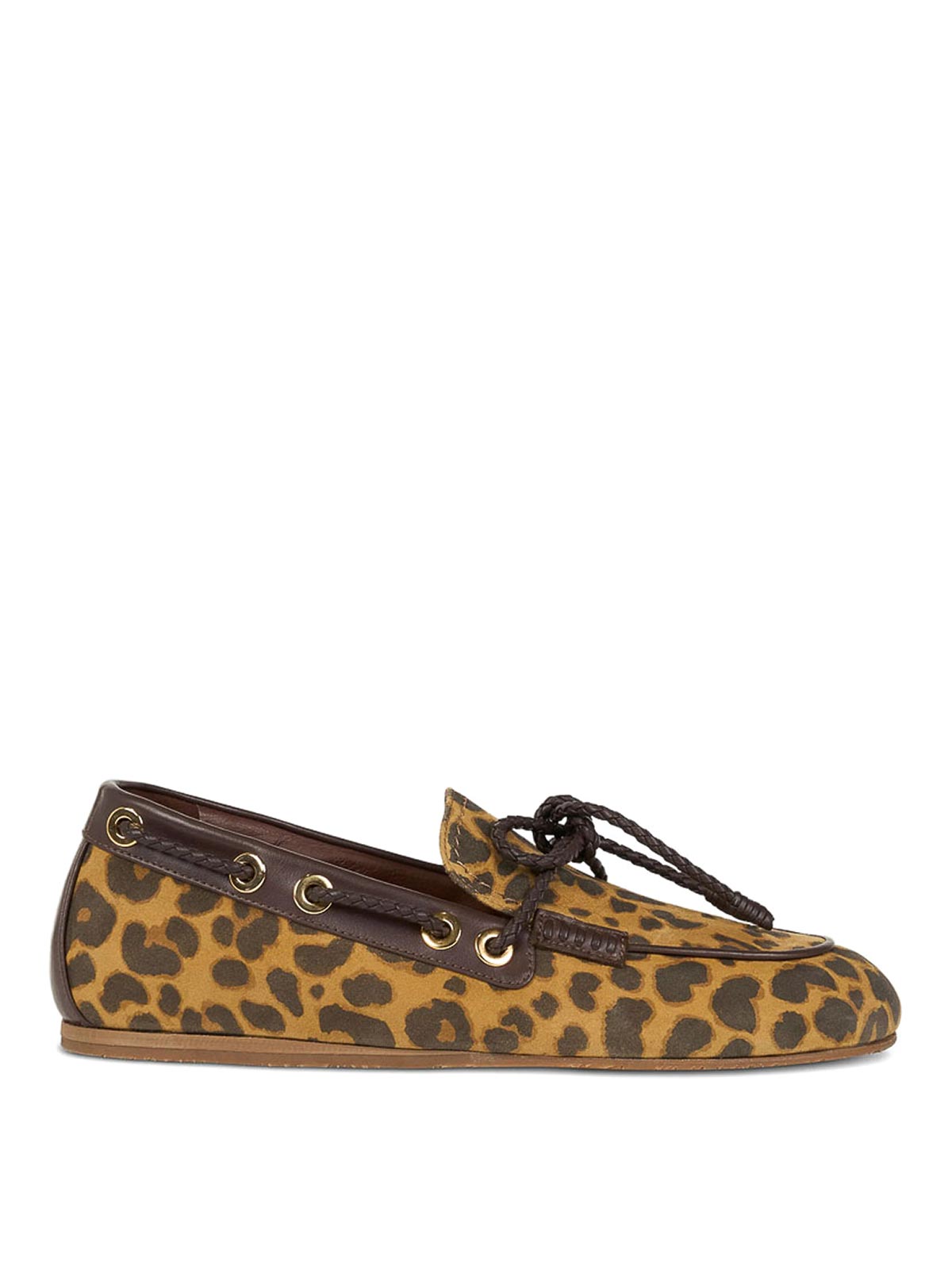 Gamuza marrón con estampado animal, herrajes dorados, cierre de encaje, punta redonda