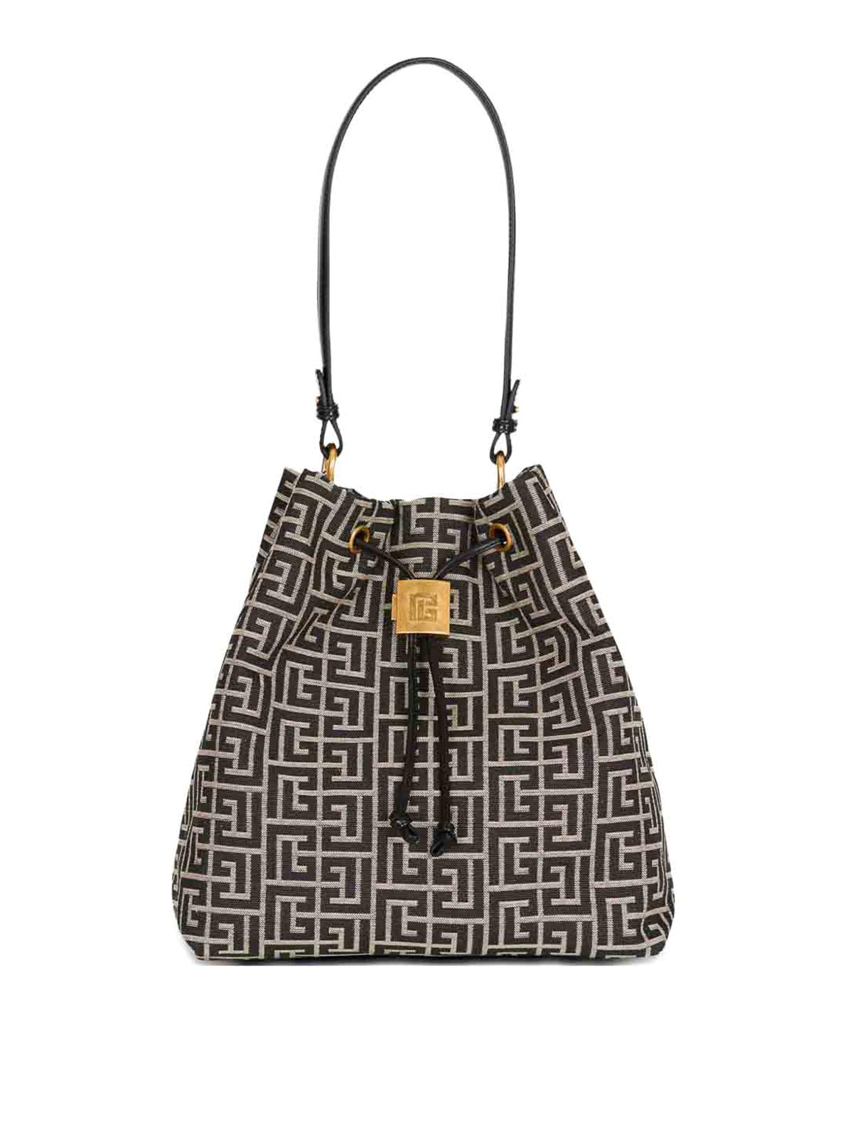 Diseño de monogramas en negro y beige, herrajes dorados, cierre con cordón, asa superior desmontable