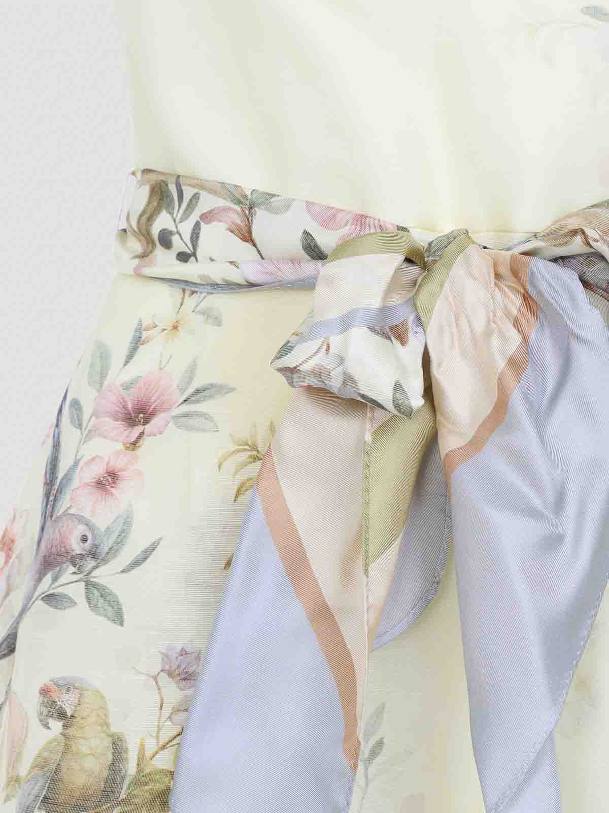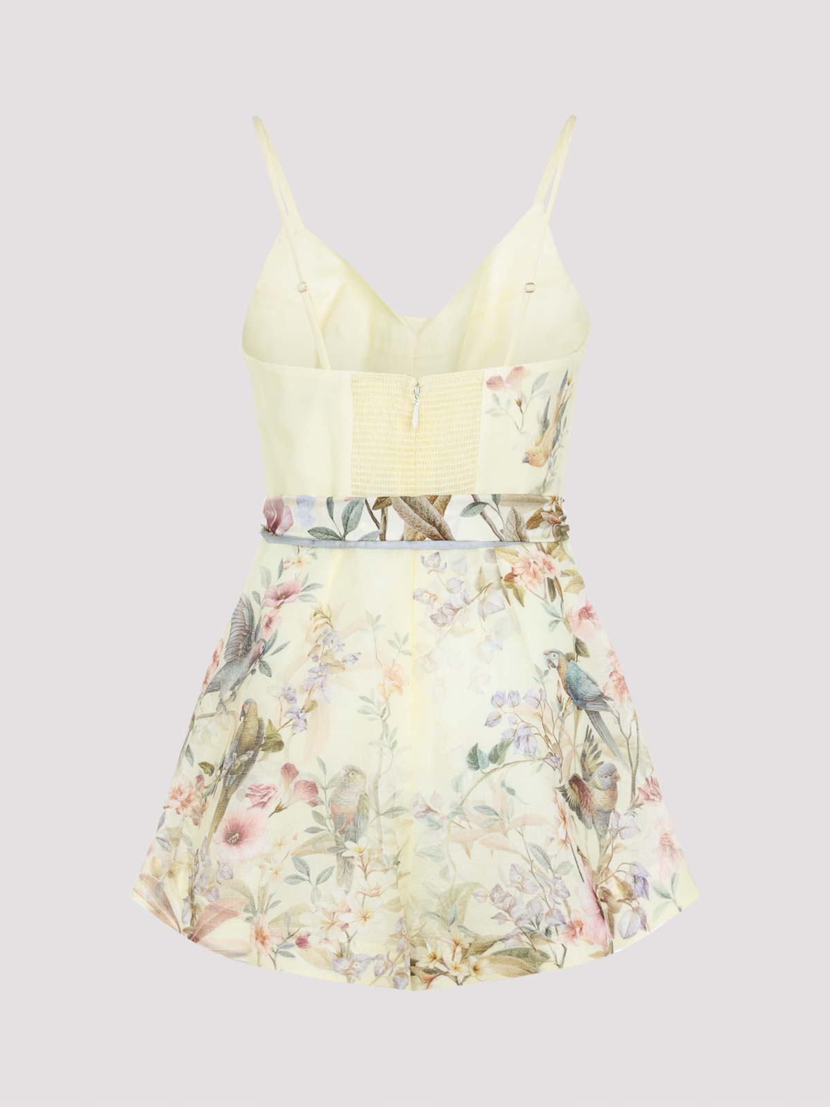 Mono ajustado Rebellion de lino amarillo limón de Zimmermann. Confeccionado en lino y seda. Tirantes finos y ajustables, diseño de corpiño, detalle elástico en la espalda, sin mangas, trabillas, cinturón tonal, dobladillo recto. Fondo amarillo limón con diseño multicolor de pájaros y flores.