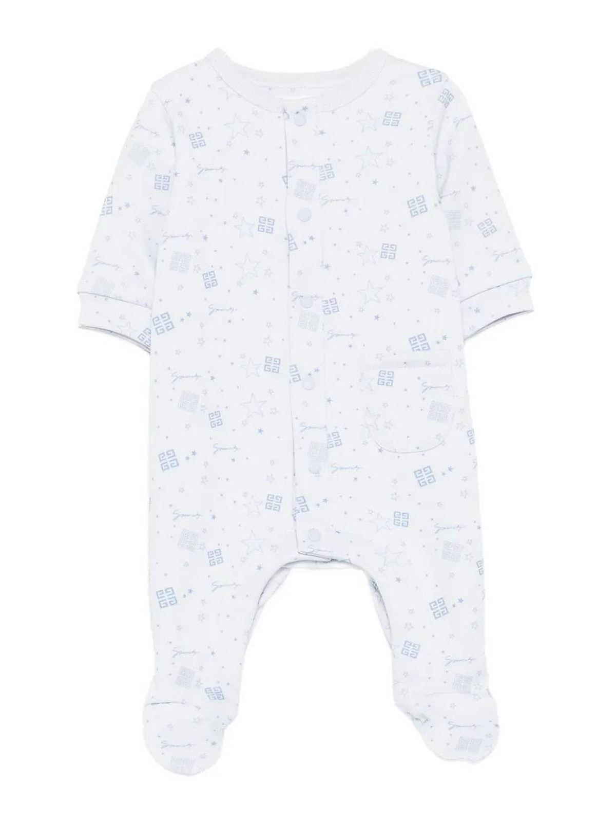 Mono con logotipo azul claro, motivo de estrellas, estampado de logotipo, manga larga, cierre con botones a presión, perneras con pies
